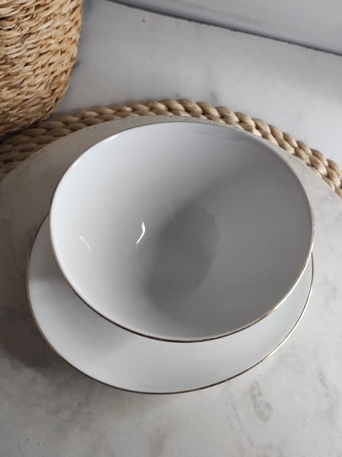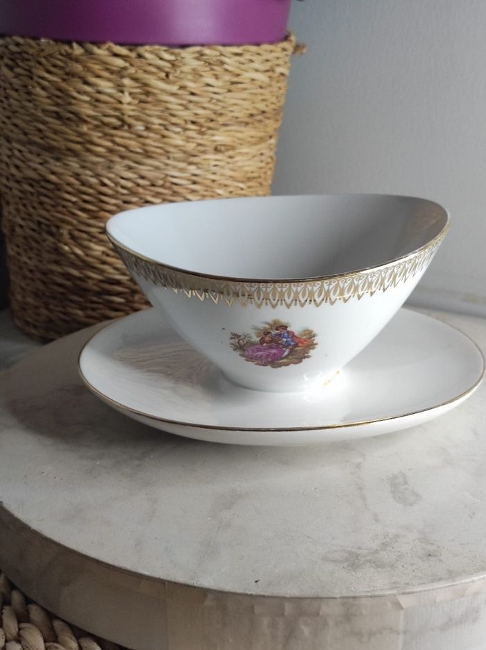 Saucière ancienne des année 1935. Véritable porcelaine , winterling Roslau Bavaria ( Allemagne) Motif Fragonard et lisere dorer. En parfait État Dimensions H 8 x D 14 / 13