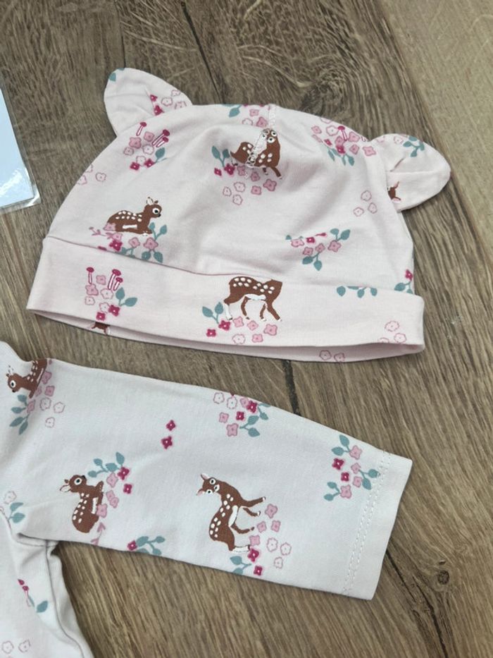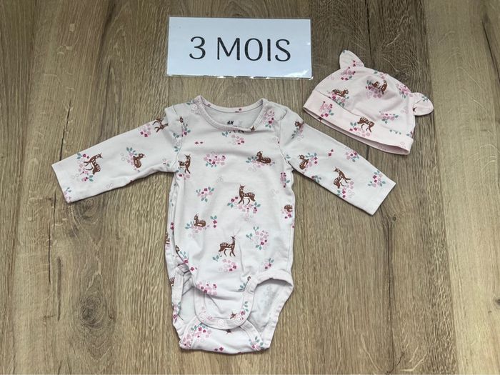 Lot body et bonnet H&M motif biche et fleurs, très bon état. À noter tout de même que le rose du body est légèrement plus terne que le bonnet (certainement car mis et donc lavé plus souvent). #3moisf_ophebt