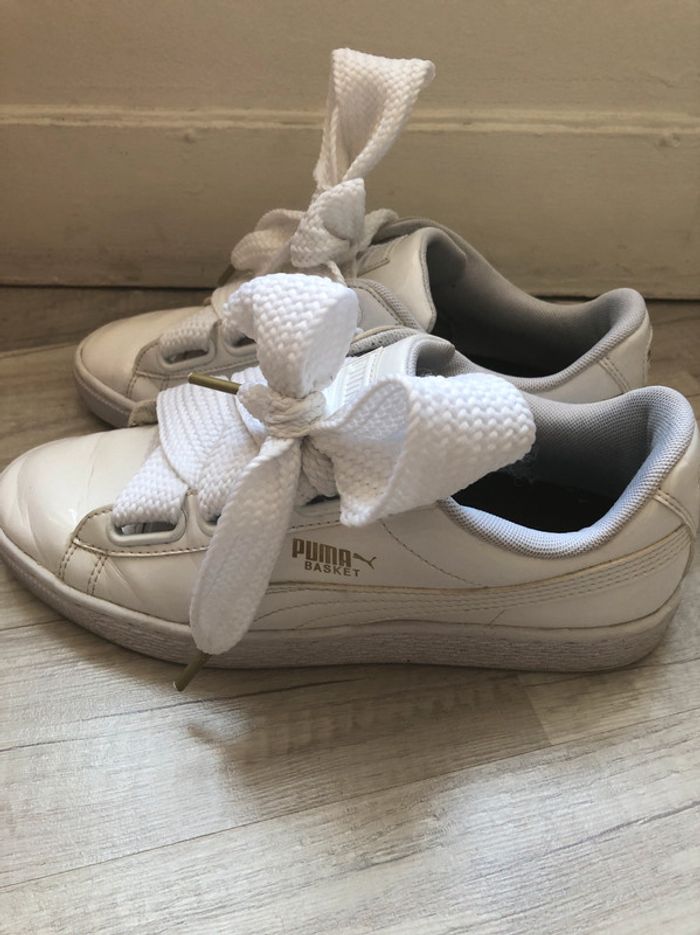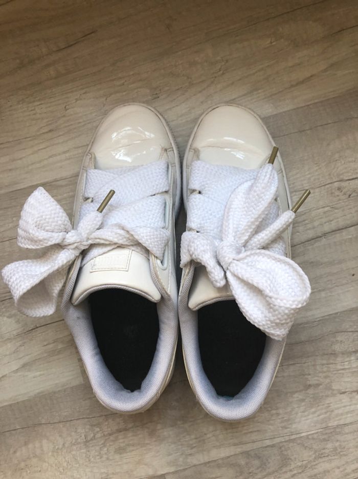 Baskets Puma blanches, Heart Patent, avec lacets et rubans, portées quelques fois. Pointure 38