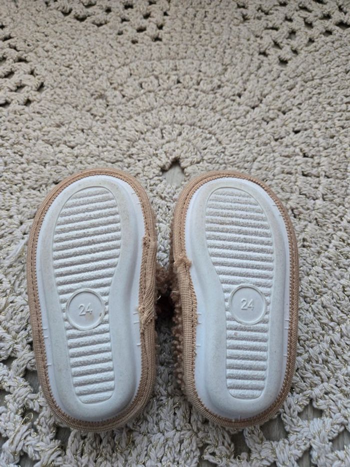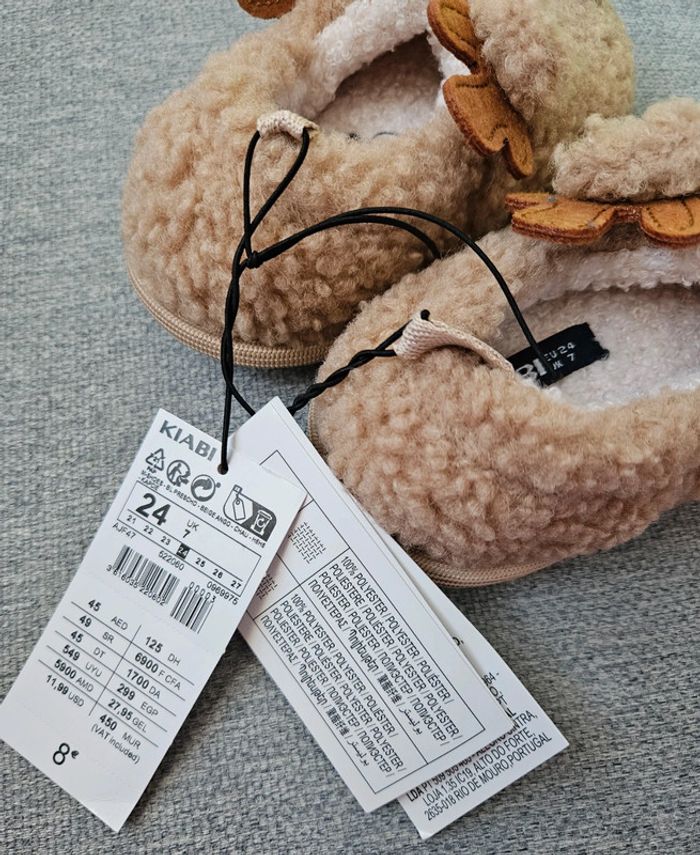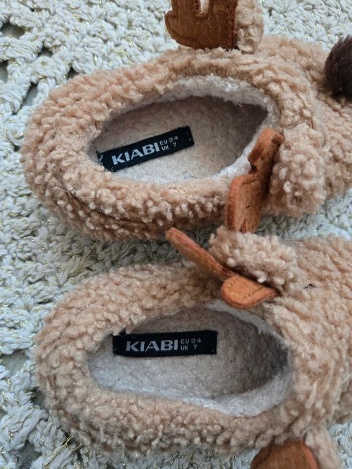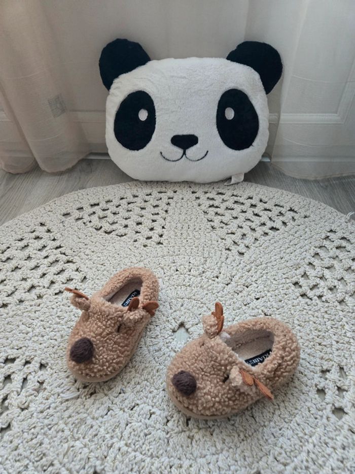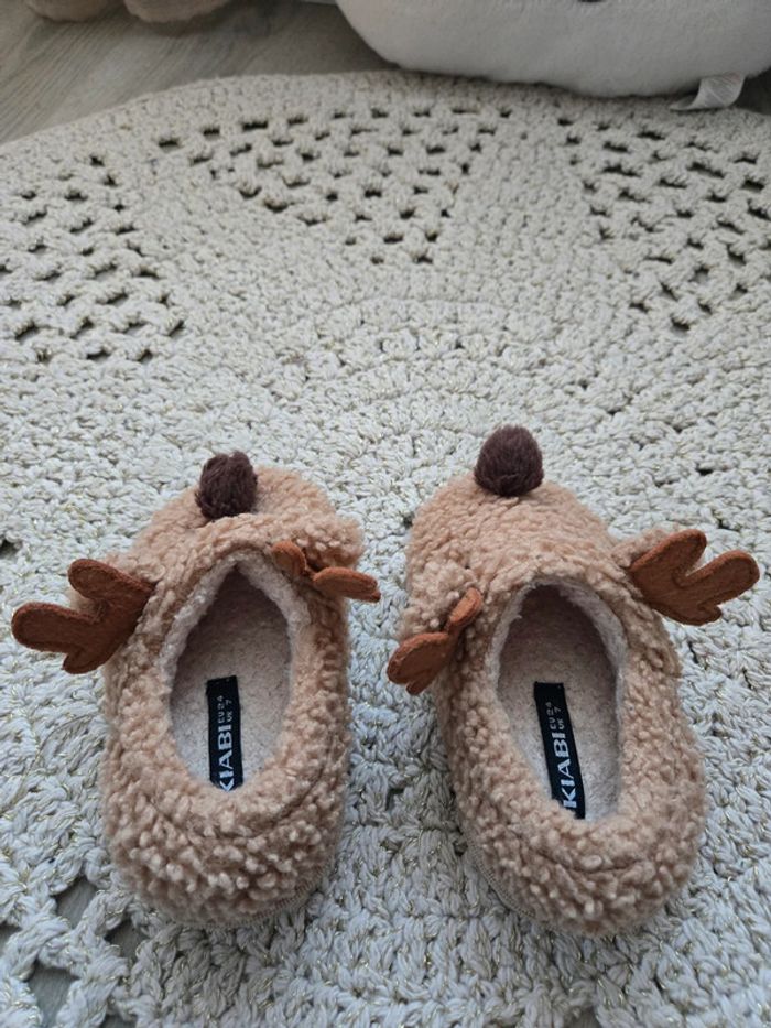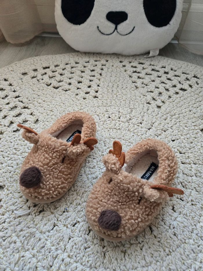 🌈 Chaussons en bouclettes Kiabi, pointure 24, motifs rennes 🫎! Très mignons et peu portés, ils sont en très bon état et propres 👌. Les semelles dessous sont solides et antidérapantes.