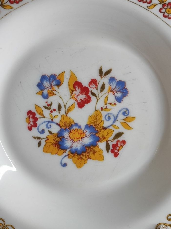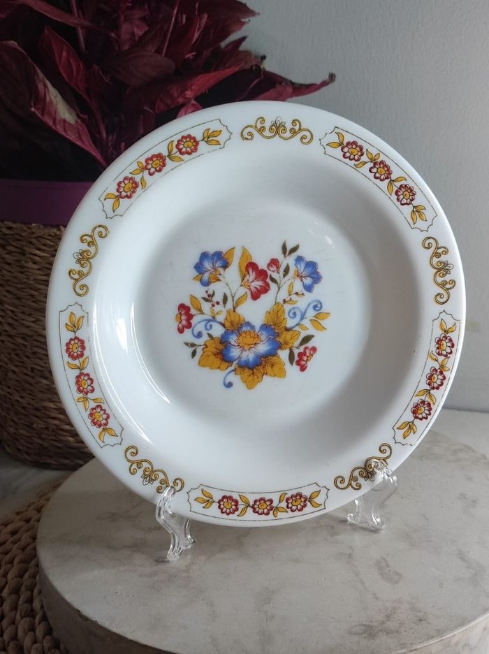 Adorable assiette creuse Arcopal, modèle Dehli. Aucune fêle ou ebruchures, seul de léger petite trace d'usage sur le fond. Diamètre 21,5 cm