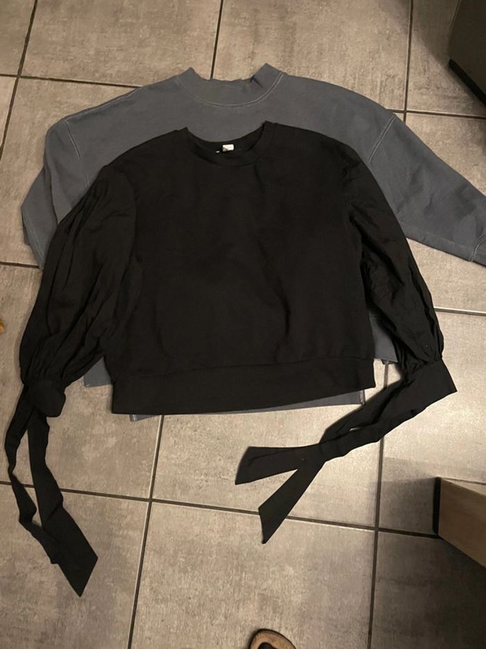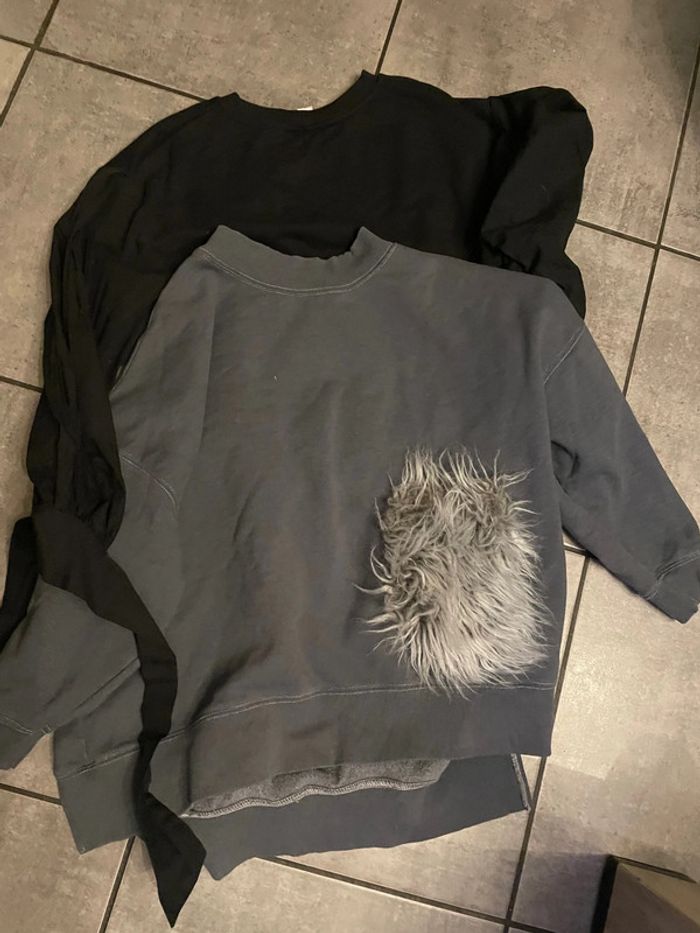 Un Pull gris Zara, taille M oversize et un pull noir manches en popeline taille L en très bon état. je vends les deux pour cinq euros