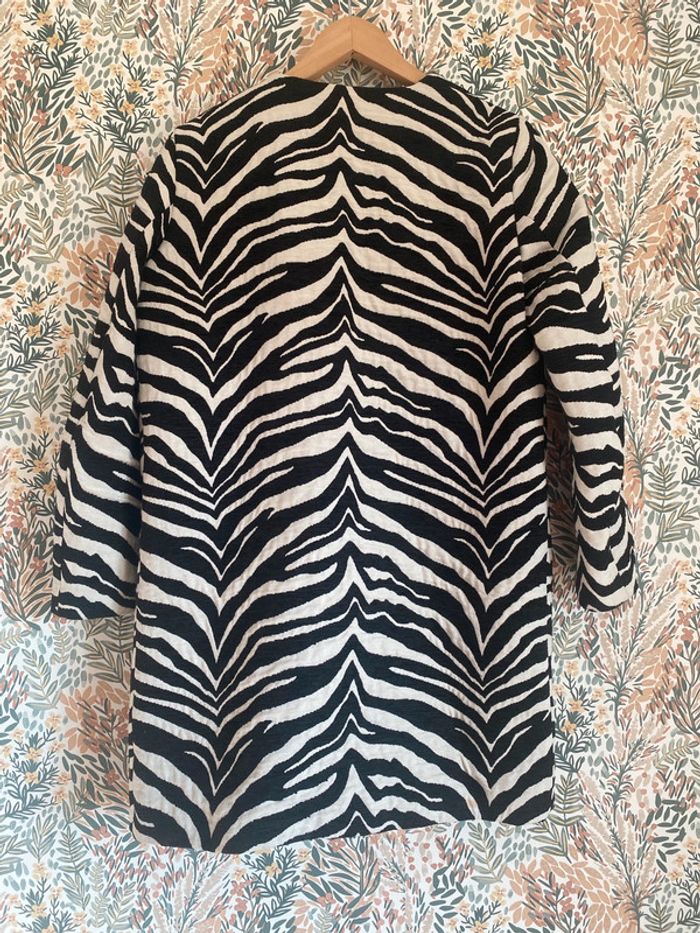 Superbe manteau zèbre (tissu jacquard). Il fait très chic et rehausse tout de suite une tenue. J'ai toujours eu des compliments !