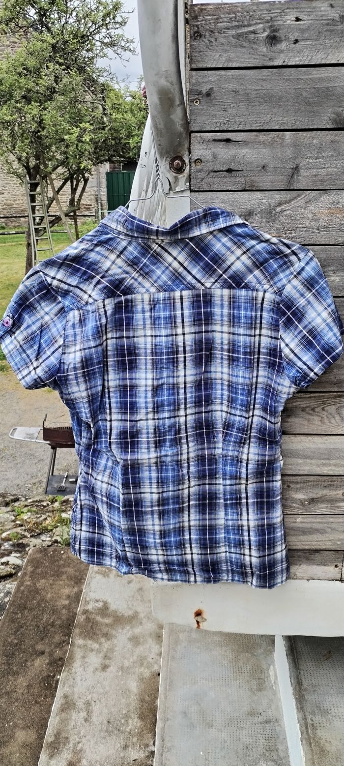 Chemisier à carreaux bleu à manches courtes pour femme. Marque Cache Cache. Taille S. Comme neuf. Que mondial relais ou Relais Colis.