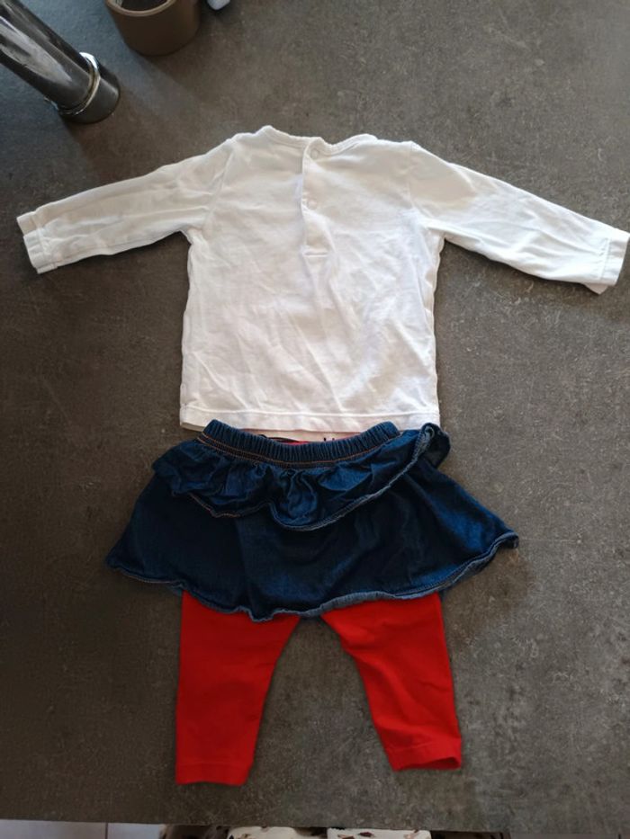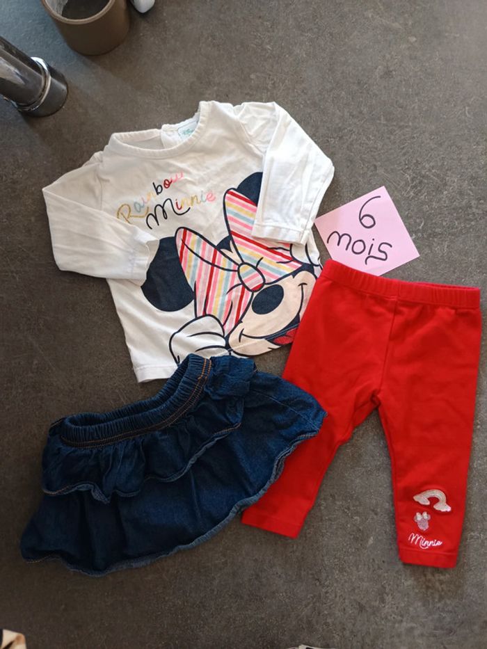 Ensemble 3 pièces : - 1 t-shirt manches longues, blanc motif Minnie et inscription "rainbow Minnie" - 1 legging rouge avec un arc en ciel et tête de Minnie - 1 jupe Très bon état, peu porté ! Taille 6 mois #vetementbebefille6moisjustine182129