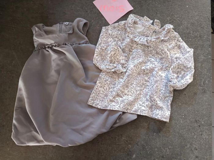 Ensemble 2 pièces : - 1 haut manches longues avec petit col motifs fleurs couleur lilas - 1 robes bouffante sans manches grise NEUF jamais porté ! Taille 6 mois #vetementbebefille6moisjustine182129