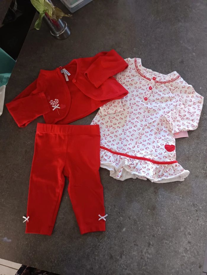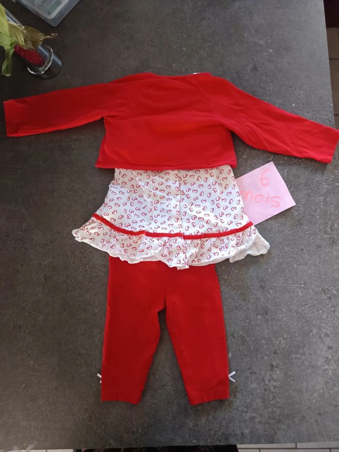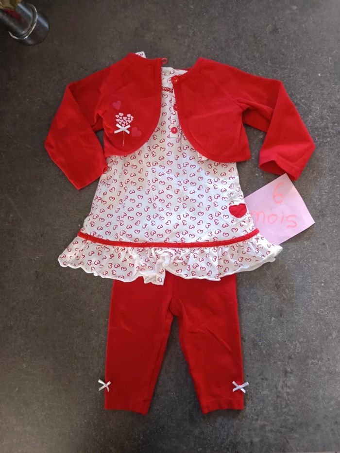 Ensemble 3 pièces : - 1 Boléro rouge motifs coeurs et petit noeud blanc - 1 tunique blanche avec coeurs rouges - 1 legging rouge avec petits noeuds en bas EXCELLENT état, peu porté ! Taille 6 mois J'ai également cet ensemble en 1 mois sans le gilet et en 3 mois. #vetementbebefille6moisjustine182129
