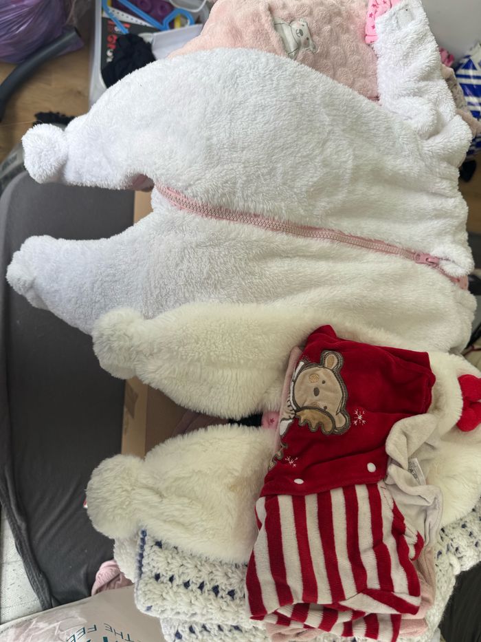 Il y a au moins une 15aine de pyjamas hiver, une 15aine de bodys, deux gigoteuses, 3 combi-pilotes bien chaude, des hauts manches longues, des leggings, des robes.. Et j’en passe.
