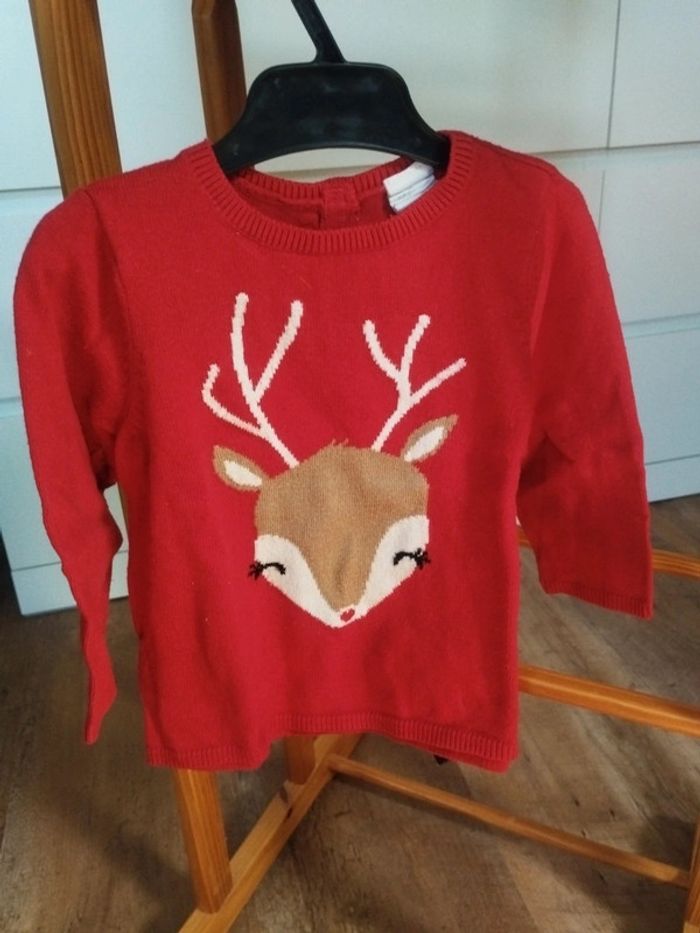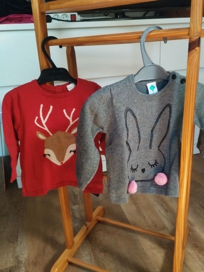 Lot de 2 pulls 1 pull rouge renne 1 pull gris lapin Taille 9 mois, 74 cm H&M et Tex Baby #mabiquette10fille9mois