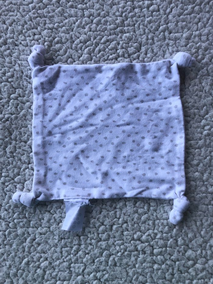 Doudou plat mouchoir blanc Motifs des pois gris Occasion en très bon état ( étiquette de la marque coupée ) Vous achetez le doudou que vous voyez sur la photo