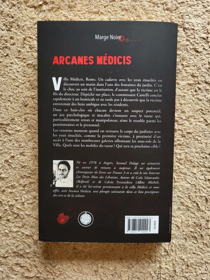 ⭐️ Nombreux livres dans mon dressing réductions sur les lots activées ✨️ 📚 Livre "Arcanes Médicis", un thriller signé Samuel Delage, spécialiste du roman à suspense 📖 Très bon état 📍Suspense et psychologie au rendez-vous avec une enquête immersive dans le décor prestigieux de la Villa Médicis 📕 Alors que la quiétude règne sur la Villa Médicis, un cadavre est découvert un matin dans l'une des fontaines des jardins. Ce drame bouleverse les artistes pensionnaires et le personnel, d'autant que la victime est le fils du directeur de ce lieu incontournable de l'art et de la culture. Dépêché sur place, le commissaire Castelli conclut rapidement à un homicide et ne tarde pas à découvrir que la victime entretenait des liens ambigus avec les résidents. Dans ce huis-clos où chacun devient un suspect potentiel, un jeu psychologique et macabre s’instaure avec le tueur qui, particulièrement retors et manipulateur, sème le trouble parmi les pensionnaires et le personnel