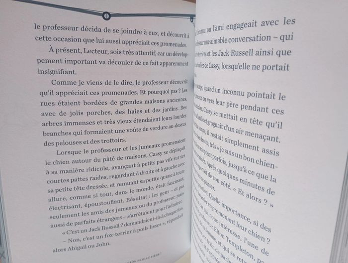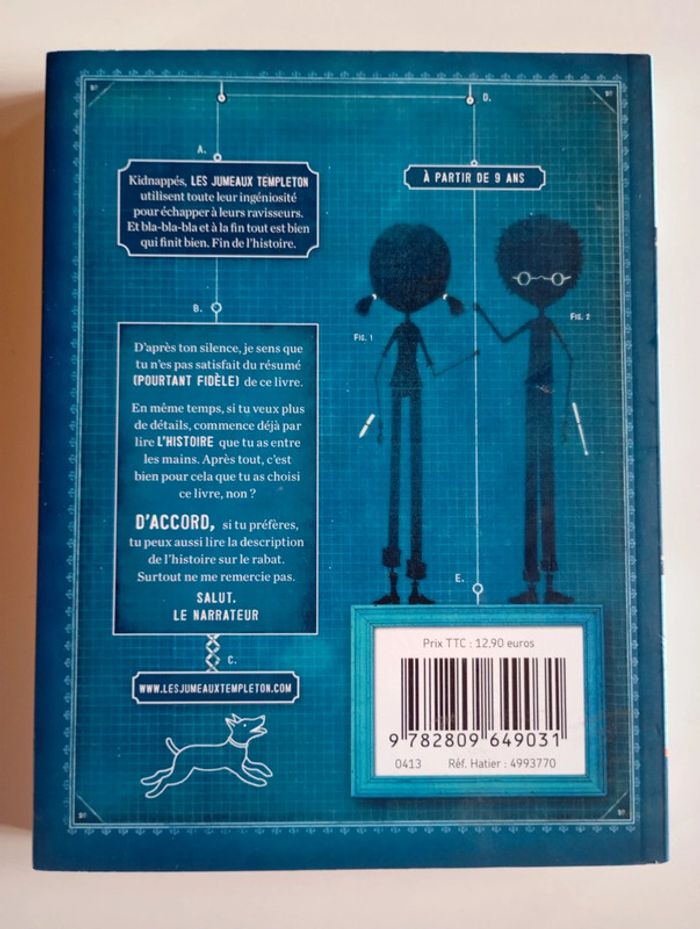 Mettons que John ait un esprit pratique et joue de la batterie, et que Abigail ait un esprit logique et résolve des mots croisés cryptés. Maintenant imagine que leur père soit un inventeur brillant, quoique souvent distrait. Et imagine que d'autres jumeaux, adultes cette fois, Dean D Dean et Dan d Dean, décident de kidnapper les jumeaux Templeton et leur chien ridicule (qui est un fox-terrier) pour que leur père livre une de ses inventions géniales. Oui j'ai bien dit kidnapper ! Ne serait-ce pas amusant de lire une telle histoire ? Bien sûr, que ce serait le cas ! Ce livre est parfait pour les garçons et les filles astucieux, malins et drôles (comme les jumeaux), et qui aiment lire des livres d'aventures (mais qui n'aime pas ça). Éditeur ‏ : ‎ Play Bac 225 pages Âge de lecture ‏ : ‎ 9 - 11 ans Dimensions ‏ : ‎ 15.5 x 1.7 x 20.3 cm Livre NEUF #jumeaux