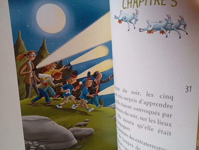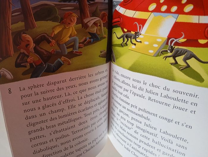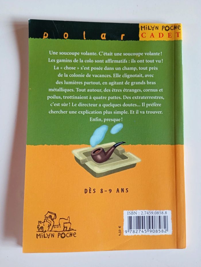 Une soucoupe volante. C'était une soucoupe volante ! Les gamins de la colo sont affirmatifs : ils ont tout vu ! La " chose " s'est posée dans un champ, tout près de la colonie de vacances. Elle clignotait, avec des lumières partout, en agitant de grands bras métalliques. Tout autour, des êtres étranges, cornus et poilus, trottinaient à quatre pattes. Des extraterrestres, c'est sûr ! Le directeur a quelques doutes... Il préfère chercher une explication plus simple. Et il va trouver. Enfin, presque ! Éditeur ‏ : ‎ Milan Jeunesse 38 pages Âge de lecture ‏ : ‎ 7 - 9 ans Dimensions ‏ : ‎ 13 x 18 cm Livre en très bon état Je vends d'autres livres premières lectures #phil_peg_premièreslectures ou sur les vacances #phil_peg_vacances #vacances #colonie