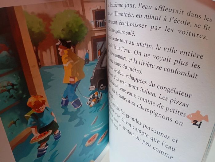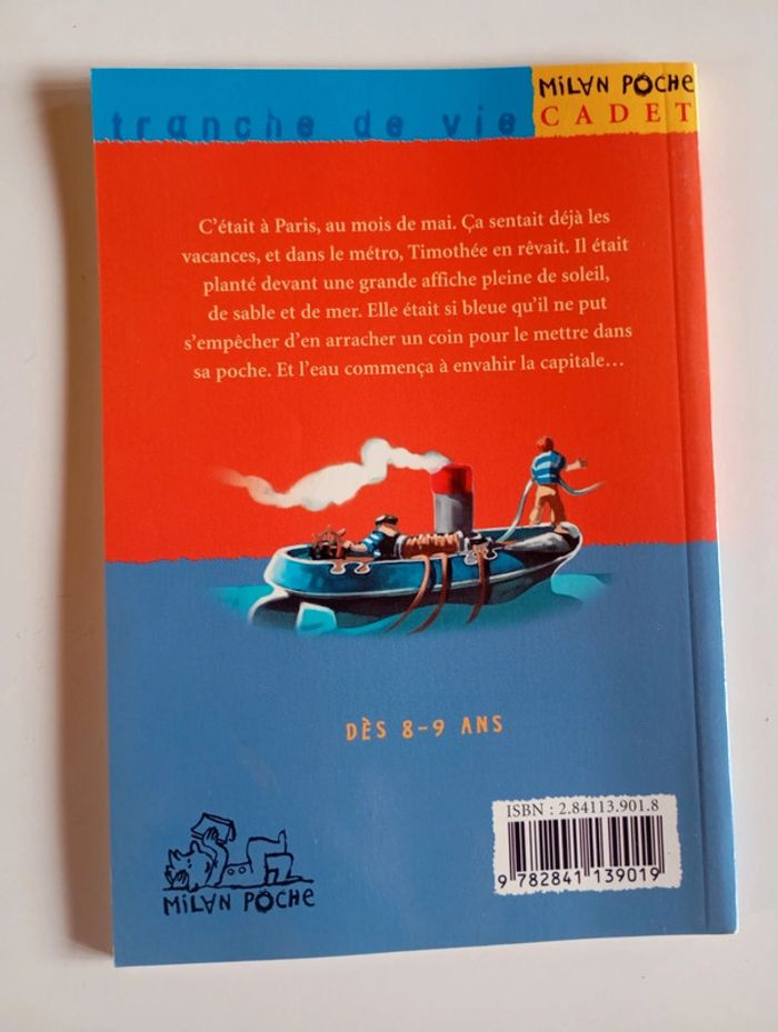 C'était à Paris, au mois de mai. Ça sentait déjà les vacances, et dans le métro, Timothée en rêvait. Il était planté devant une grande affiche pleine de soleil, de sable et de mer. Elle était si bleue qu'il ne put s'empêcher d'en arracher un coin pour le mettre dans sa poche. Et l'eau commença à envahir la capitale... Éditeur ‏ : ‎ Milan Jeunesse 39 pages Âge de lecture ‏ : ‎ 6 - 8 ans Dimensions ‏ : ‎ 13 x 0.3 x 18 cm Livre en très bon état Je vends d'autres livres premières lectures #phil_peg_premièreslectures ou sur les vacances #phil_peg_vacances #paris #vacances #mer
