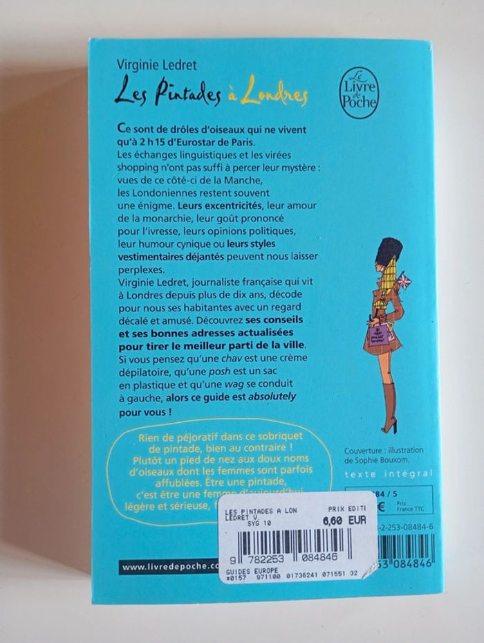 Ce sont de drôles d’oiseaux qui ne vivent qu’à trois heures de TGV de Paris. Les échanges linguistiques et les virées shopping n’ont pas suffi à percer leur mystère : vues de ce côté-ci de la Manche, les Londoniennes restent souvent une énigme. Leurs excentricités, leur amour de la monarchie, leur goût prononcé pour l’ivresse, leurs opinions politiques, leur humour cynique ou leurs styles vestimentaires déjantés peuvent nous laisser perplexes. Virginie Ledret, journaliste française qui vit à Londres depuis plus de dix ans, décode pour nous ses habitantes avec un regard décalé et amusé. Découvrez ses conseils et ses bonnes adresses actualisées pour tirer le meilleur parti de la ville. Si vous pensez qu’une chav est une crème dépilatoire, qu’une posh est un sac en plastique et qu’une wag se conduit à gauche, alors ce guide est absolutely pour vous ! Éditeur ‏ : ‎ Le Livre de Poche 320 pages Dimensions ‏ : ‎ 11 x 1.6 x 18 cm Livre état neuf Je vends un autre livre de la même collection #phil_peg_pintades #pintades #londres