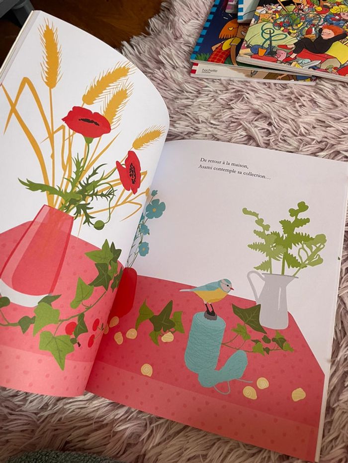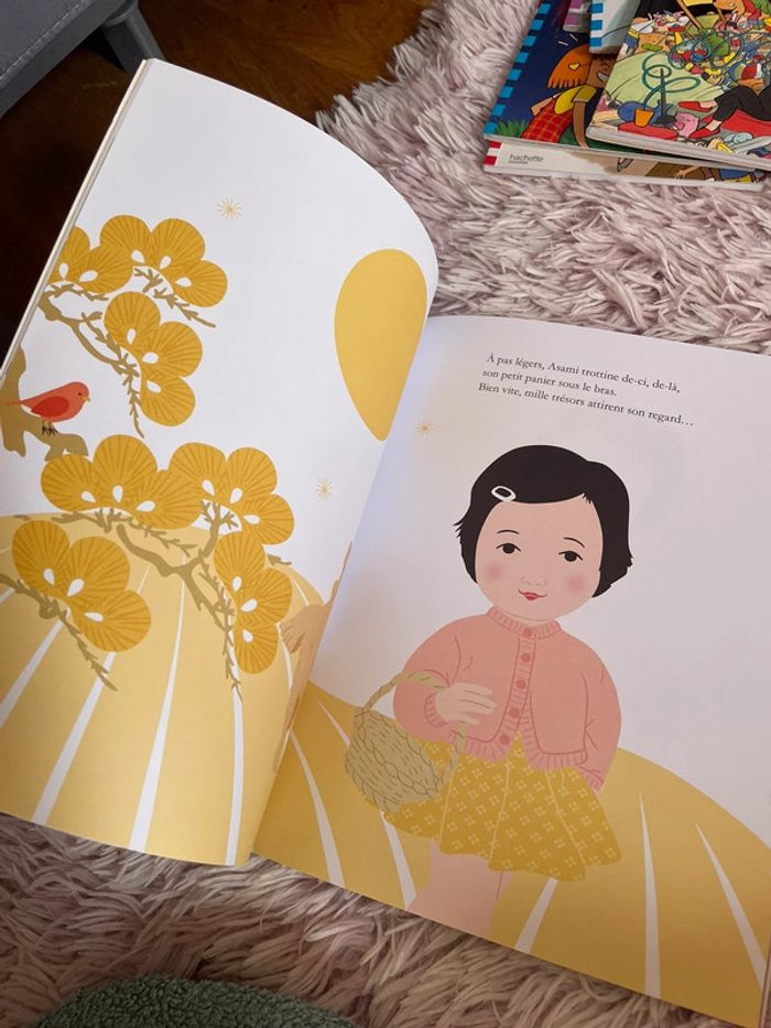 Livre La balade d’asami Valeur 12€ Excellent état LA BALADE D'ASAMI Comme sa maman est trop occupée pour lui lire une histoire cette après-midi, Asami décide de faire contre mauvaise fortune bon coeur et part se promener avec son chien Ito. Dans les champs, elle récolte l'une après l'autre des merveilles de toutes les couleurs : feuillages verts, fruits rouges, fleurs de lin bleu, épis dorés, et bien d'autres trésors... Que va-t-elle faire de ce délicat butin ? L'offrir à sa maman ? Encore mieux. Mais chut ! C'est le secret d'Asami.