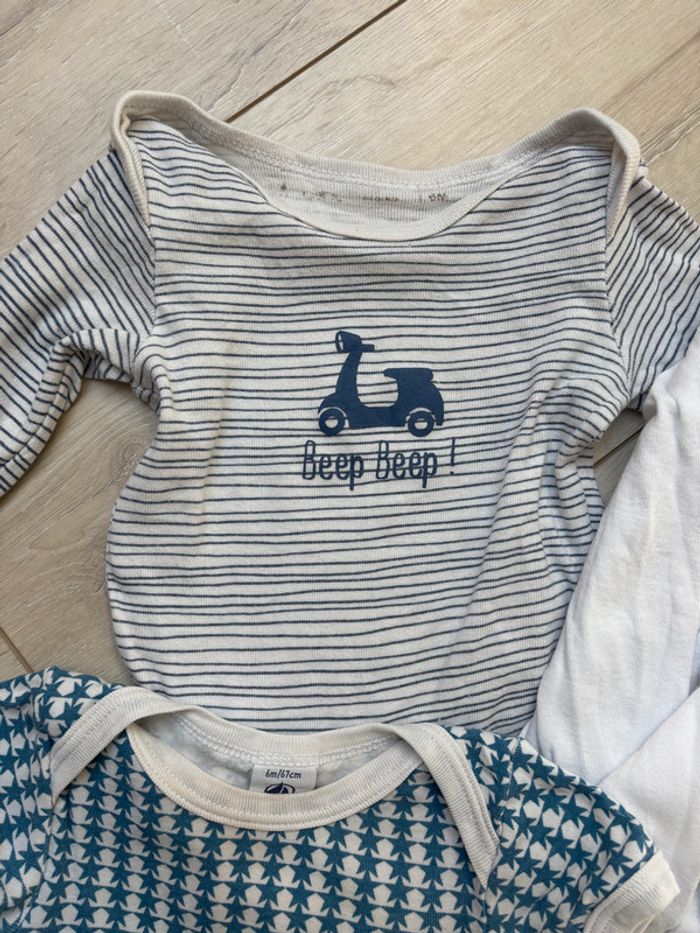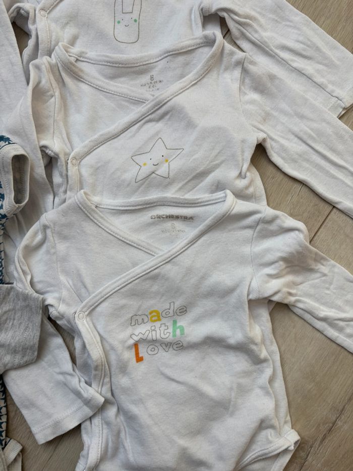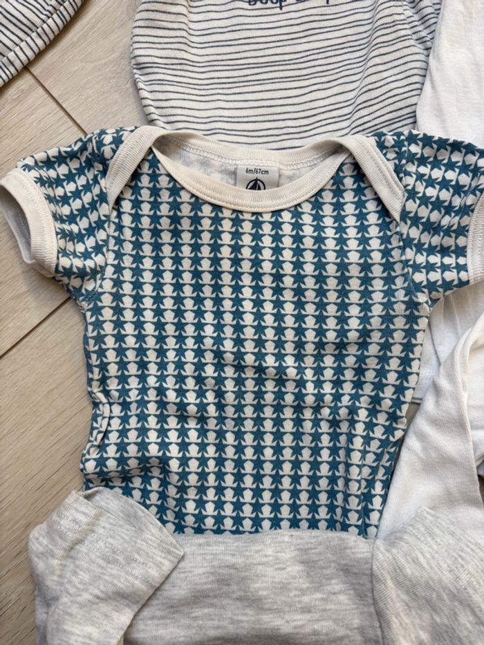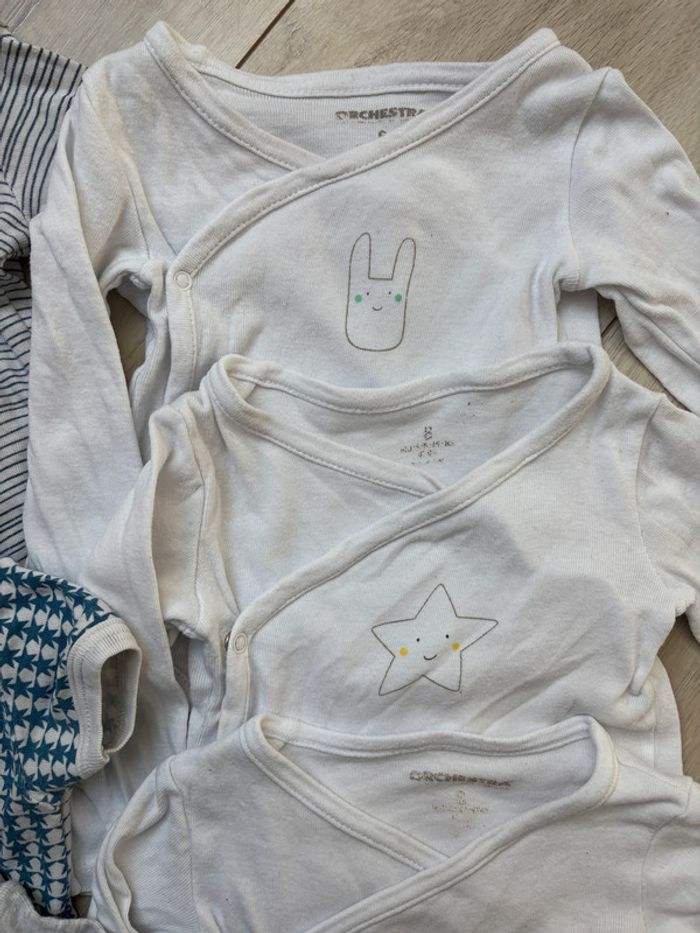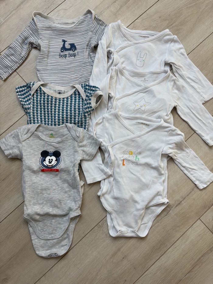 Lot bodies/ bodys Mixtes garçon et fille Blanc, bleu et blanc, motif, gris, rayures -4 bodies manches longues -2 bodies manches courtes Soit 6 bodies Taille 6 mois Marque : disney, petit bateau, orchestra, Très bon état Le disney n’a pas été porté