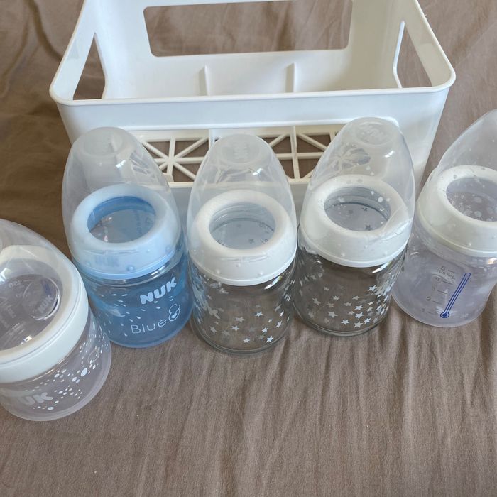 Lot de 5 biberons de la marque NUK. Deux biberons en verres , 3 en plastiques . Dans ceux en plastique il y a un transparent et un bleu avec le contrôle de la température , l’autre en plastique a également le contrôle de la température et concu pour le relai allaitement (tétine relai allaitement) Vendus sans les tétines . Vendus avec le bac de rangement. Contenance : Biberons en verre jusqu’à 120ml Biberons en plastique jusqu’à 150ml