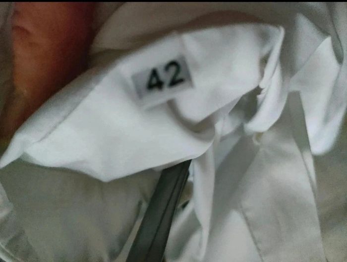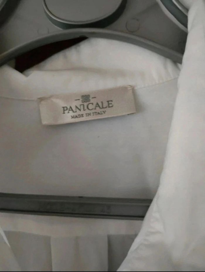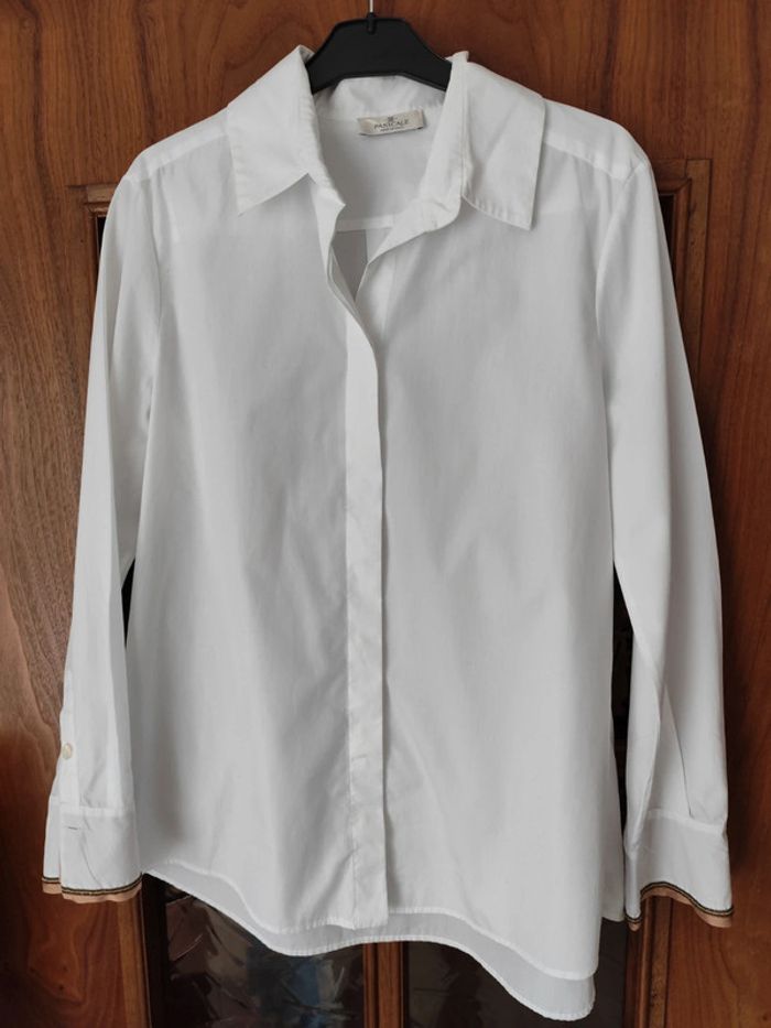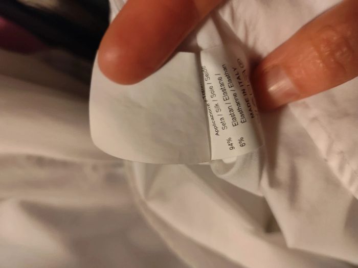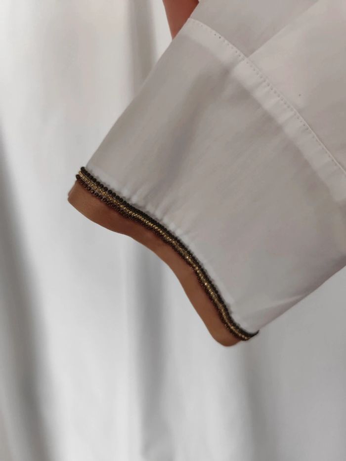 Fabriquée en Italie Taille 42 Totalement blanche sauf le bout des manches taupe avec strass dorés et brun 94% soie