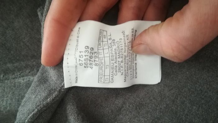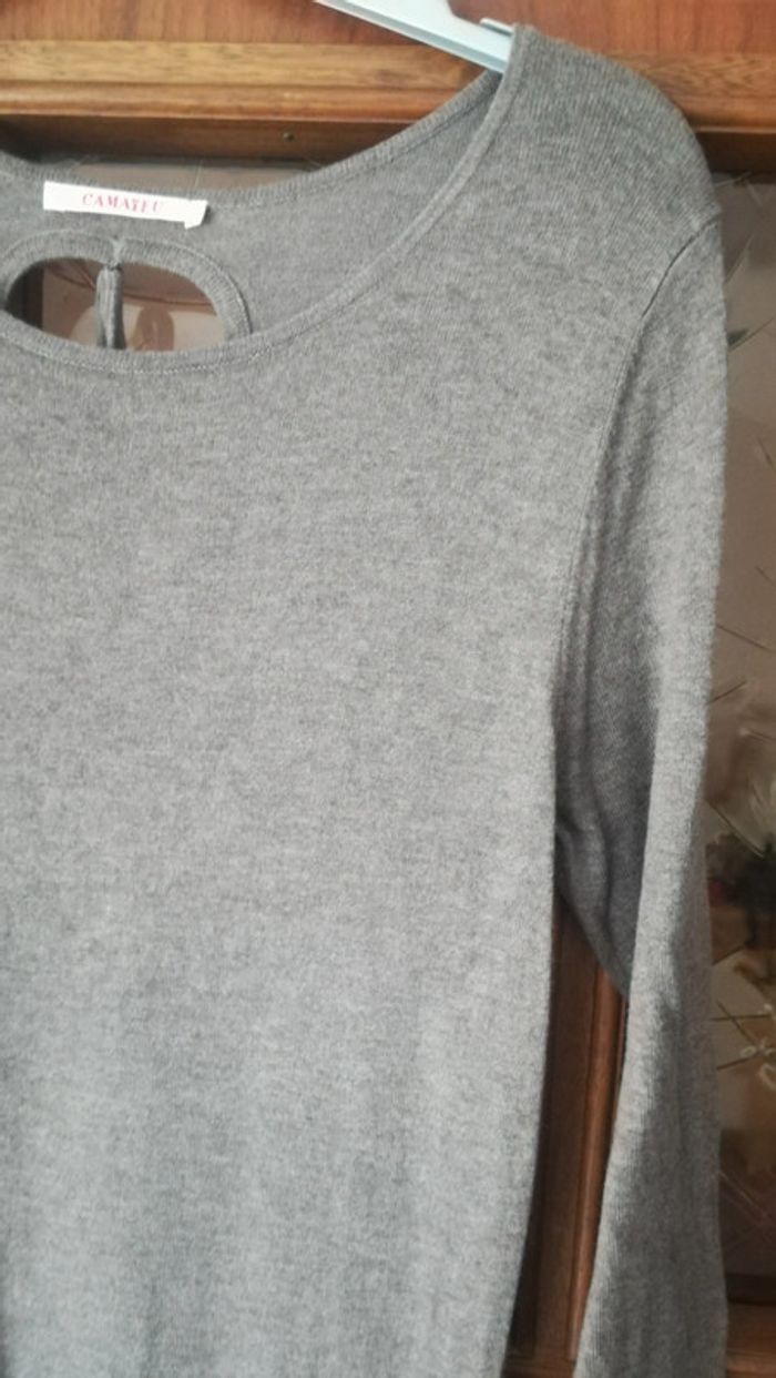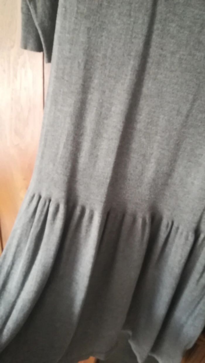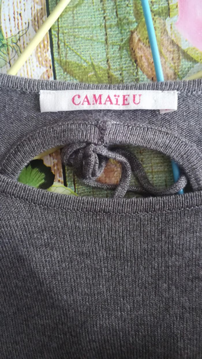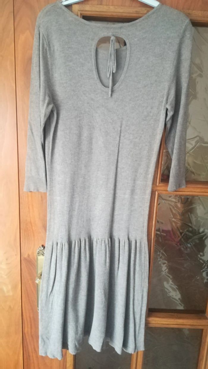En maille légère. Évasée sur le bas. Plutôt près du corps. Taille 3. Portée une fois. Couleur taupe