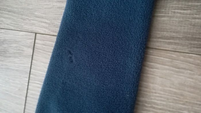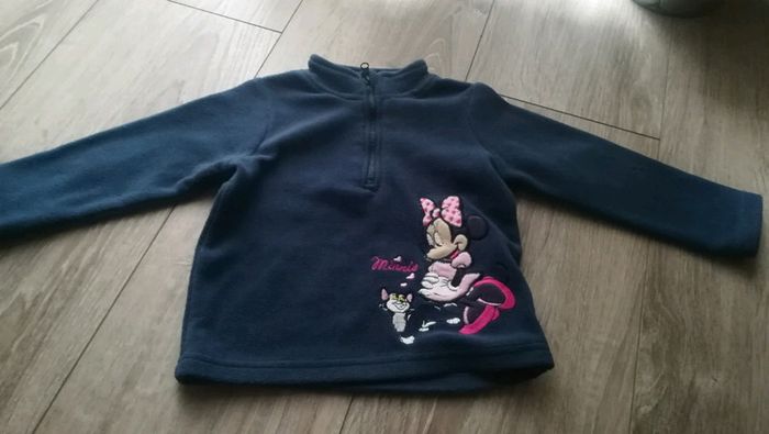 Polaire bleue avec Minnie Fermeture éclair en haut Portée par un seul enfant J'ai gratté la manche qui était tachée, du coup de la polaire est partie (voir photos)