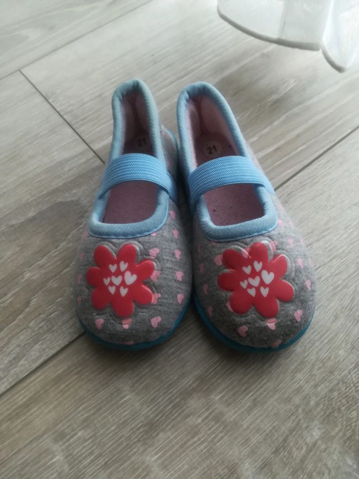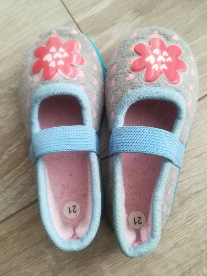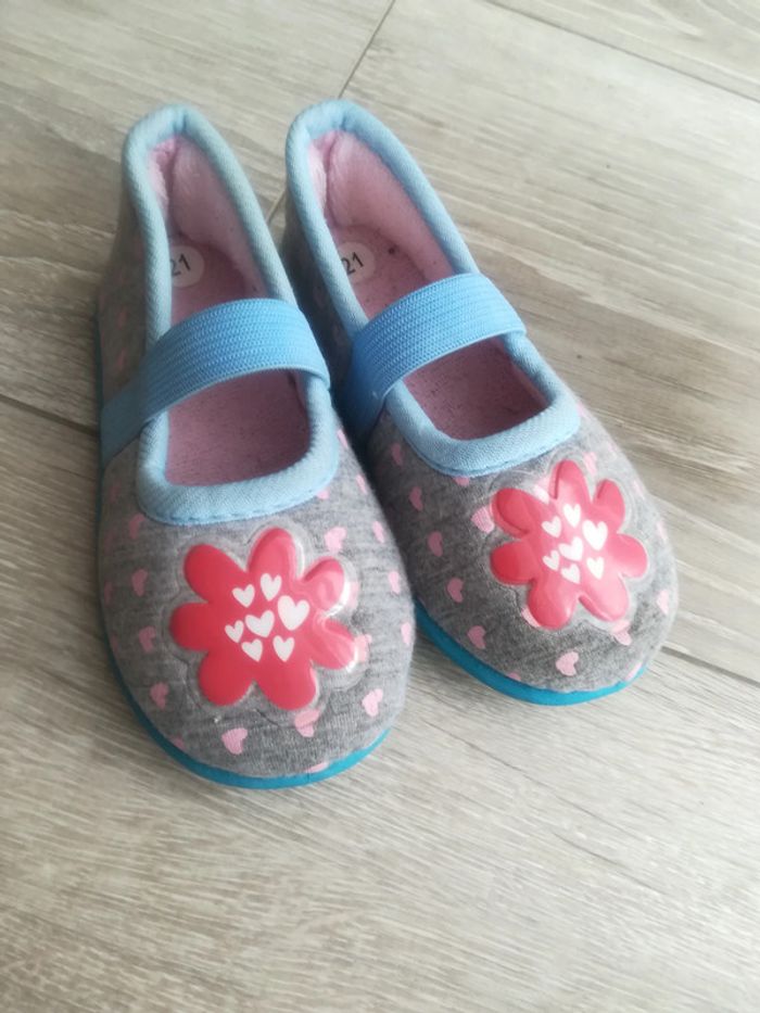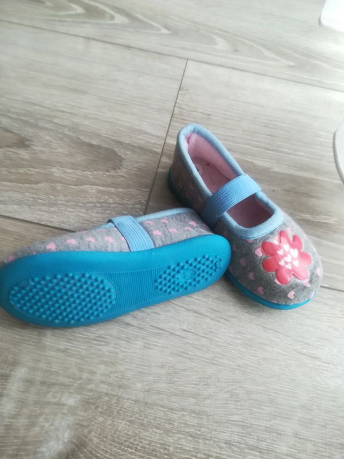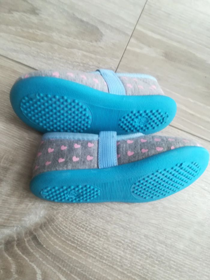 Chaussons Portés 2 fois, trop petits pour ma fille Sous formes de ballerines élastique Gris avec coeurs rose pâle Semelle bleu turquoise