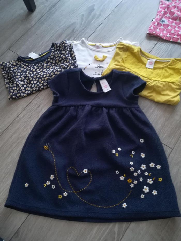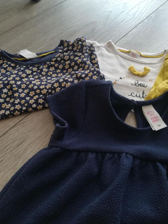 La robe a été portée 2 fois, les t shirts un peu plus souvent Robe bleu foncé, avec petites fleurs blanches et jaunes 2 T shirts à manches longues : un bleu, et un jaune, le blanc est tâché, je le retire du lot 80 cms de la marque C&A