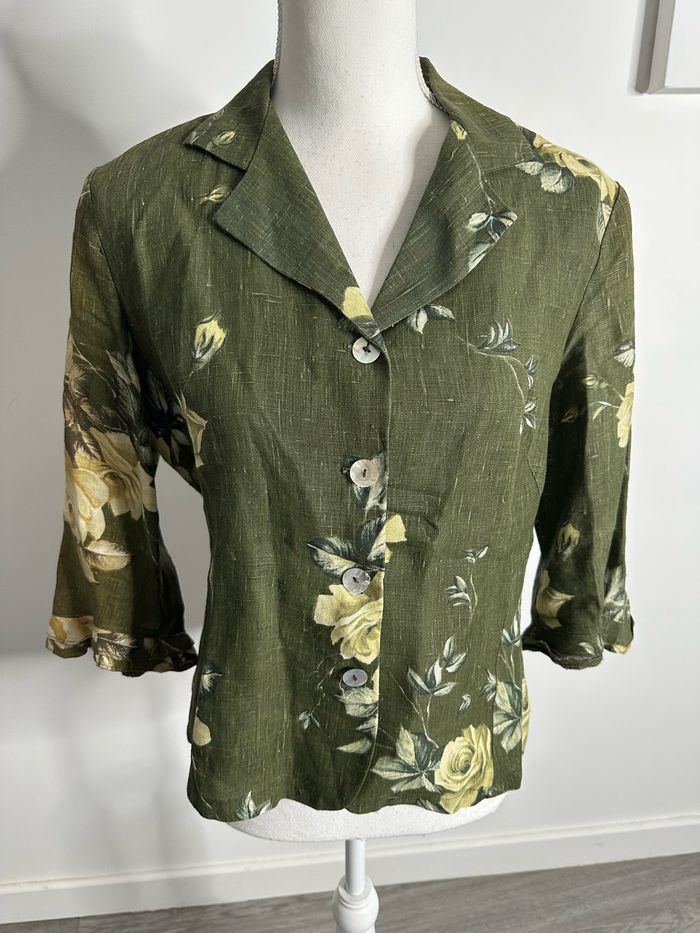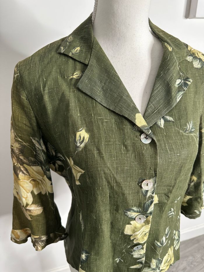 Blouse à fleurs en lin kaki et jaune Vintage T42 XL - photo numéro 2