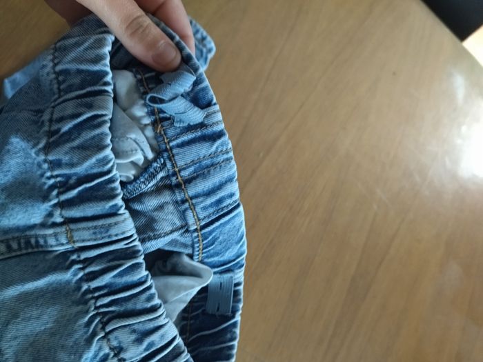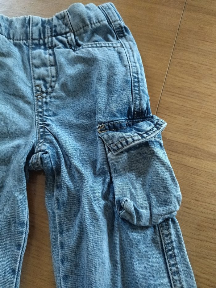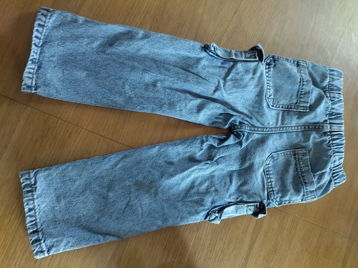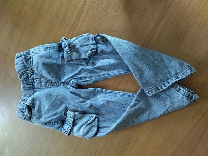 Jean cargo avec poches, taille élastique mais réglable Petit accro au niveau de la jambe (photos) mais bon état général Taille 3 ans de chez Kiabi