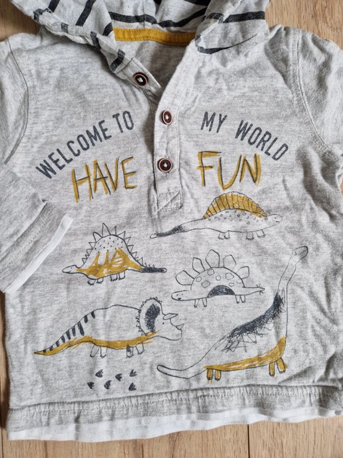 T-shirt avec capuche Motif dinosaure Excellent état Mon dressing est rangé par taille. Pour voir tous mes vêtements en 18 mois, cliquez sur le lien #celine_yiyi_18m ATTENTION pour que les liens fonctionnent, pensez à supprimer vos filtres et recherches 😊
