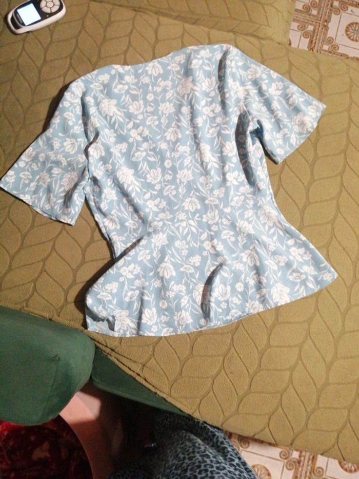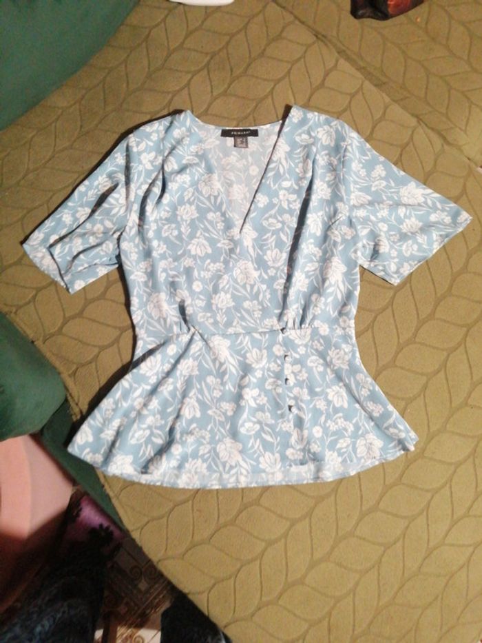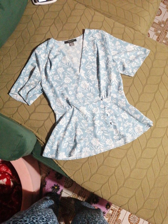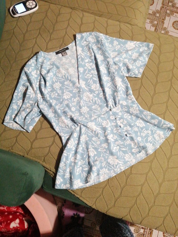 Top fleuri volanté, Col V, jolis boutons, Manches et bas de la blouse volantées, Très jolie
