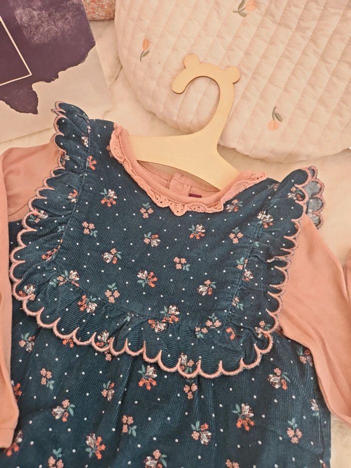 Ensemble bodie teeshirt + barboteuse velours fleurs bleu - photo numéro 2