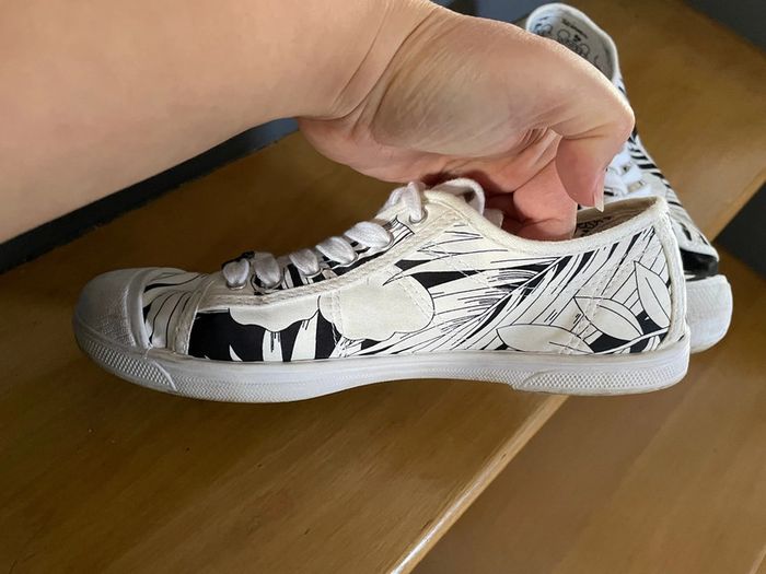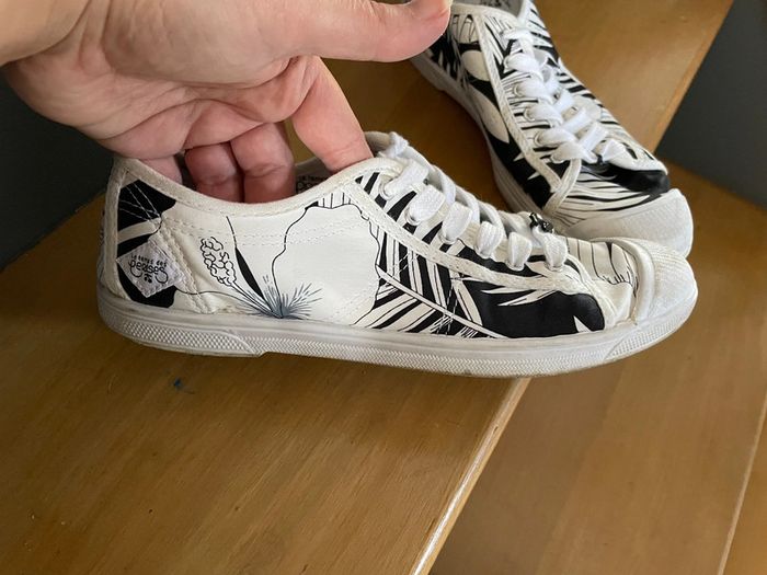 Basket blanches avec motifs tropicaux noirs, elles ont été portées 2 fois, elles sont légèrement tachées sur la semelle avant #chaussuresfemme38_sweetygirl3010