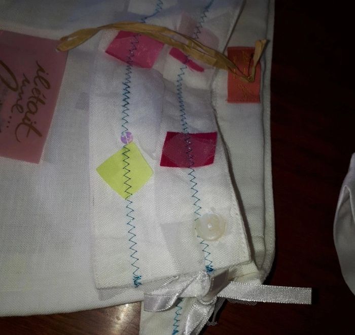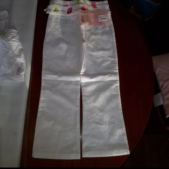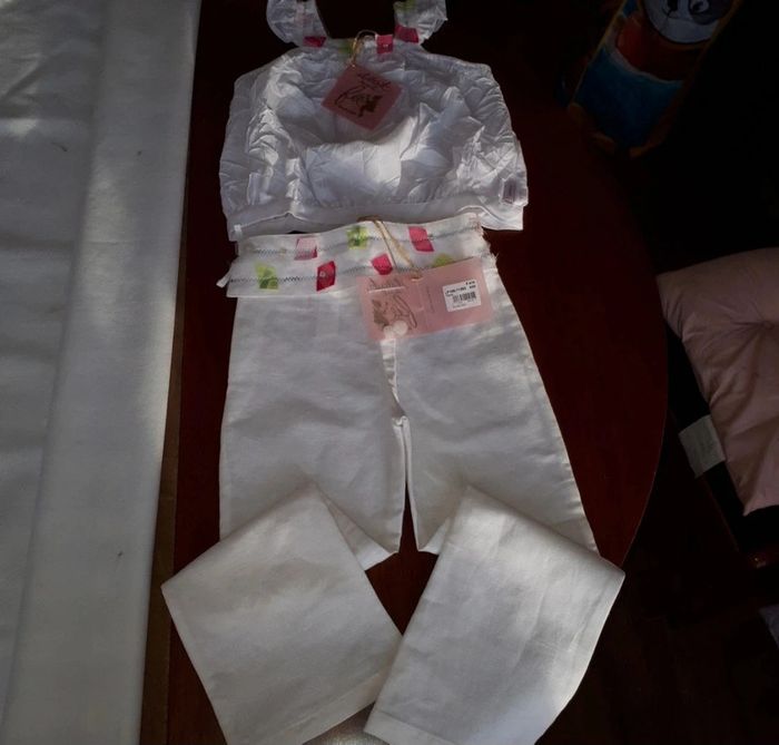 ensemble de la marque "Il était une fée" de Miniman. Taille 5 ans. L ensemble est composé d' un pantalon, pattes un peu evasées, et d'un haut sans manche avec des boutons dans le dos, effet froissé (voir photo). Le ceinture du pantalon peut s'enlever complètement, elle est maintenue par 4 boutons et un petit noeud. Il y a encore les étiquettes sur les 2. Le haut et le pantalon n'ont jamais été portés. Le haut est 65% Polyester et 35% coton, le pantalon est 55% en lin et 45% coton.