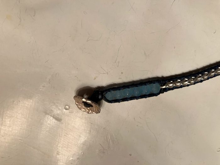 Bracelet à enrouler en  cuir noir, chaîne argentée et perles de topaze bleu ciel - photo numéro 4