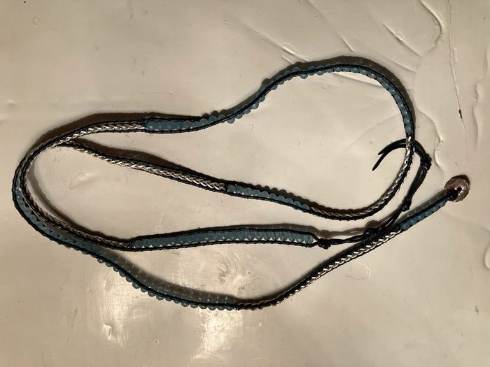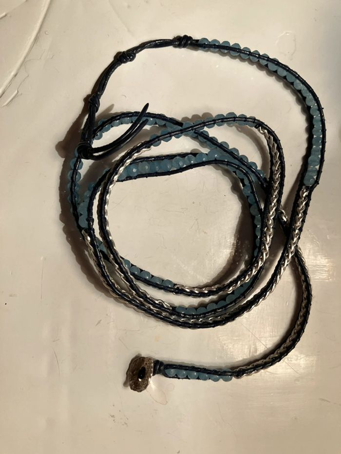 Bracelet à enrouler en cuir noir, chaîne argentée et perles de pierre fine bleu ciel. Sa longueur de 90 cm permet de faire quatre à cinq tours de poignet avec sa fermeture ajustable par trois brides sur fermoir bouton ou encore de le porter en ceinture décorative.