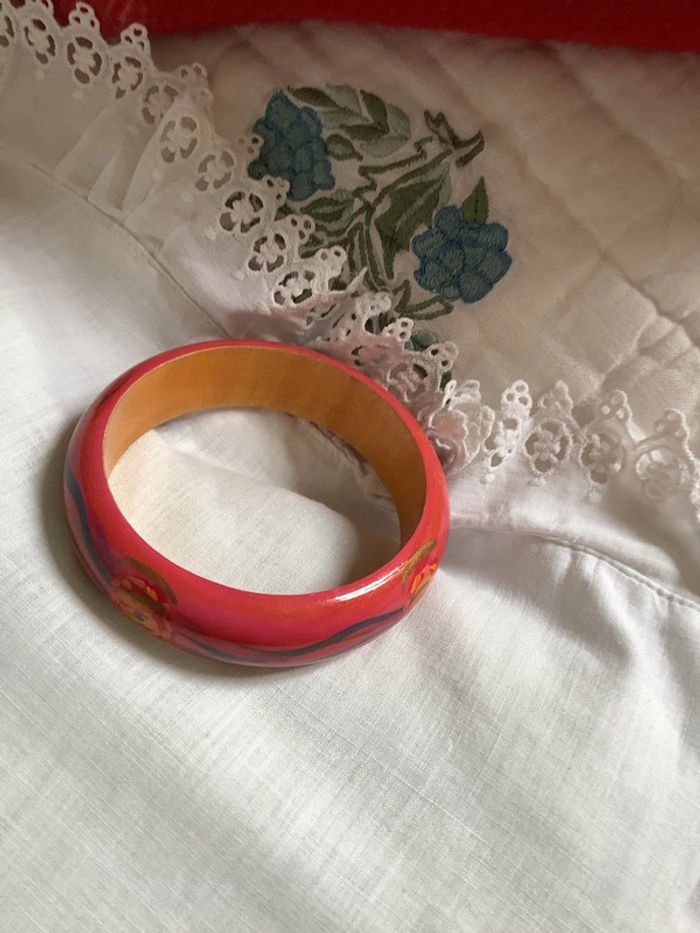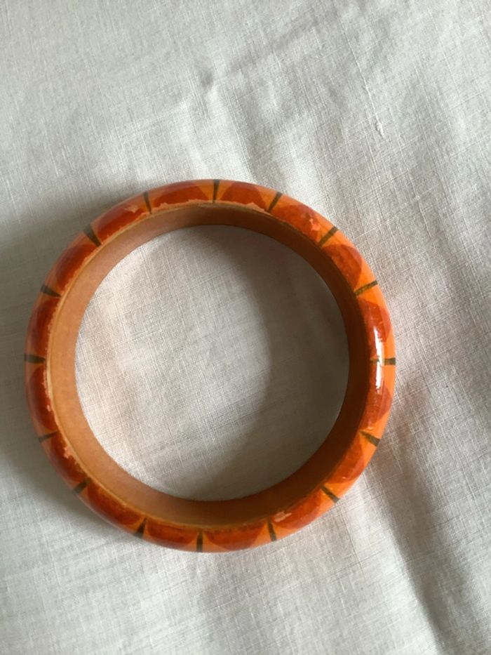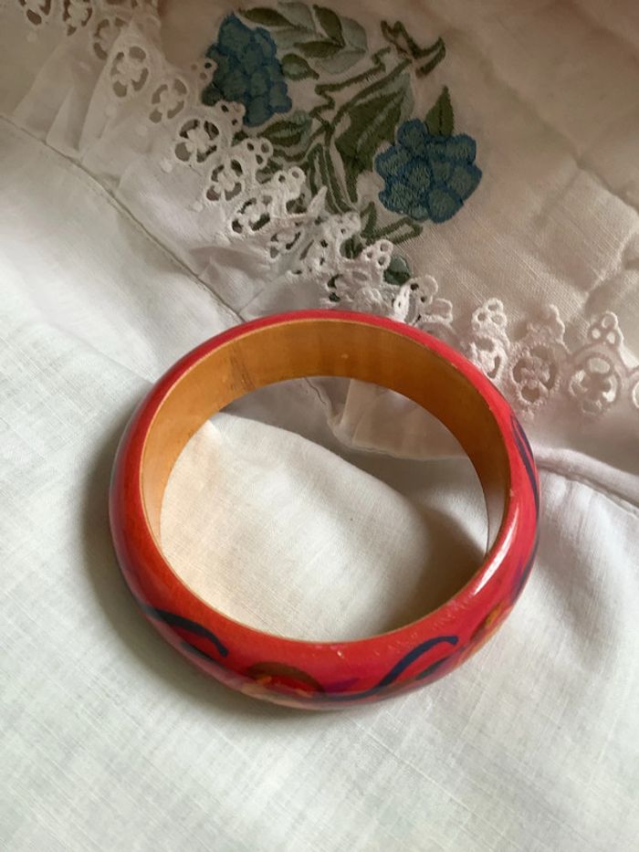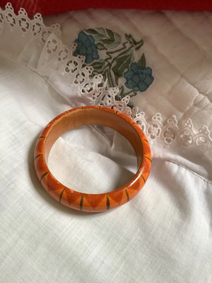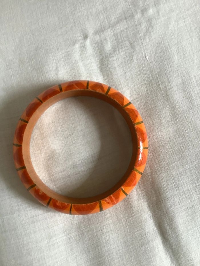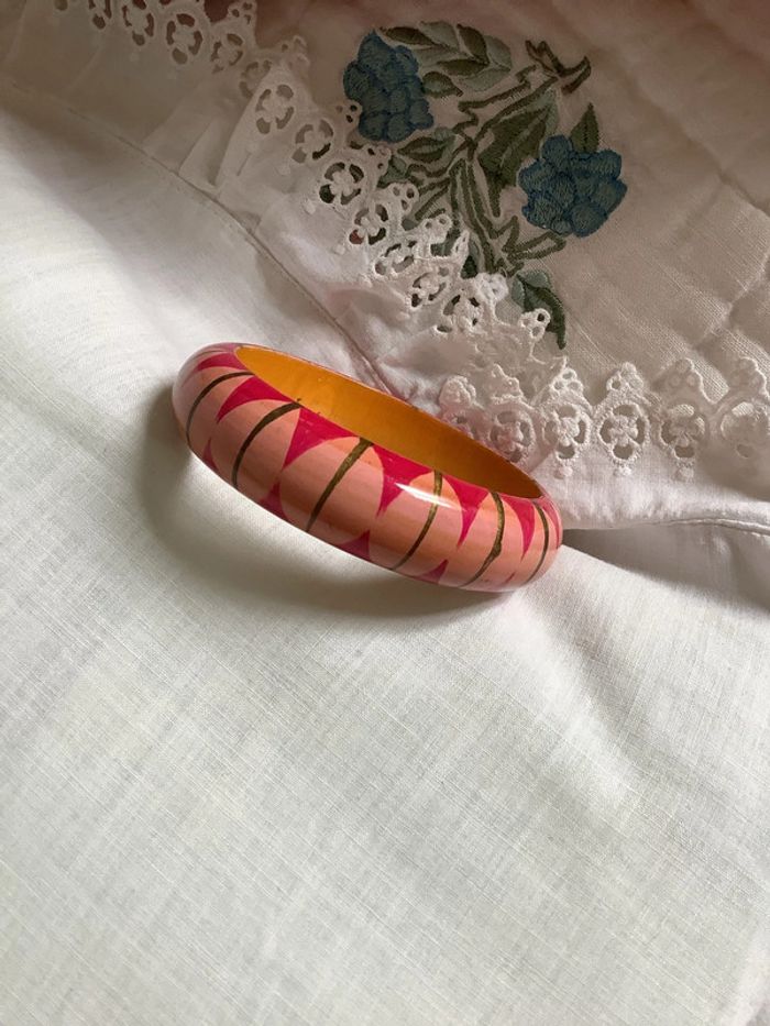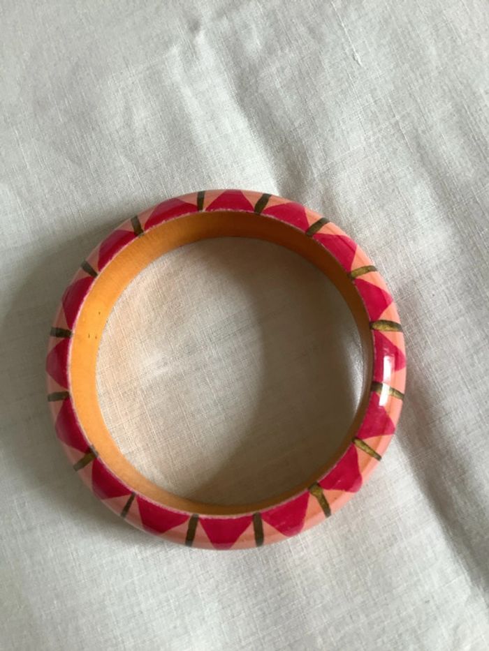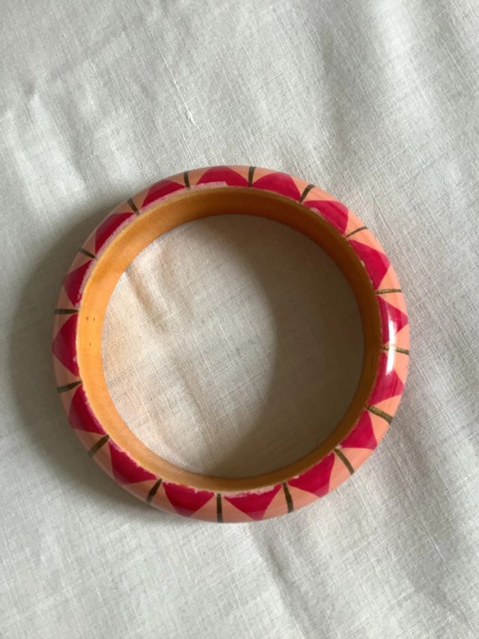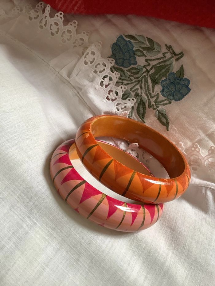 Deux bracelets en bois peint à la main, artisanal à motif géométrique . Diamètre intérieur : 6,6 cm. Largeur : 2 cm. Peu portés, tout petits éclats dus aux chocs entre eux car portés ensemble.