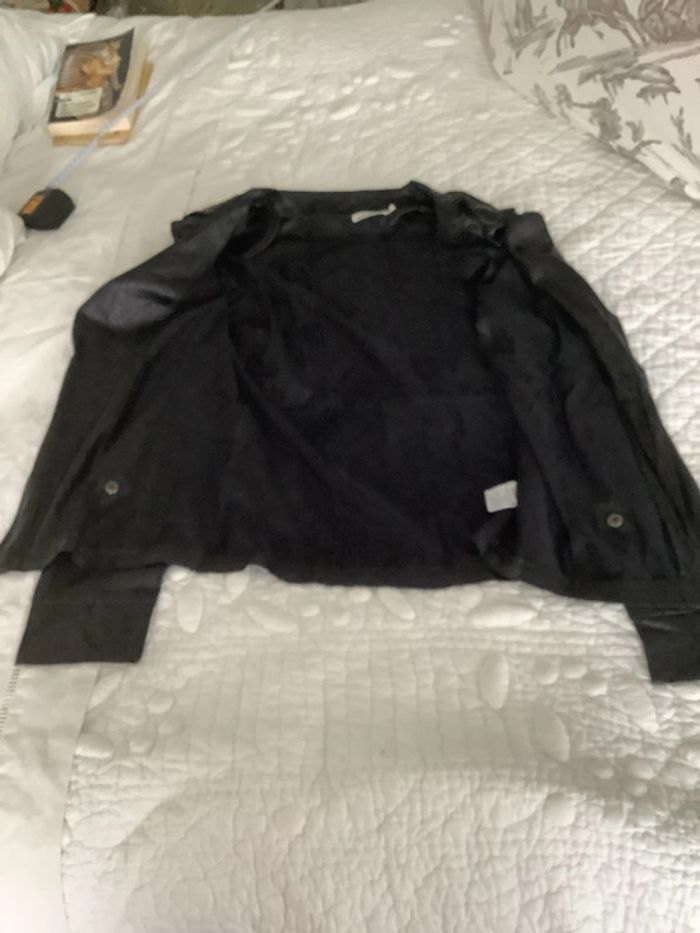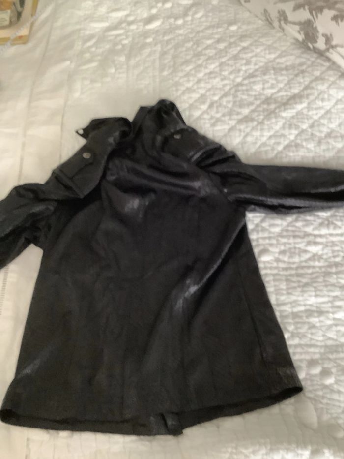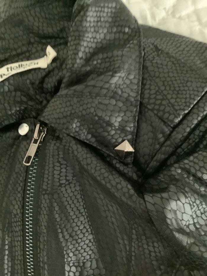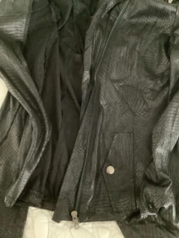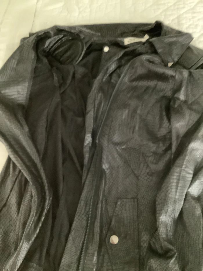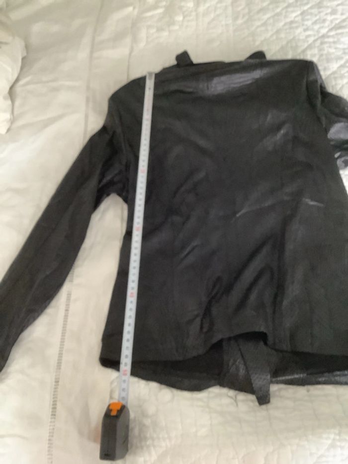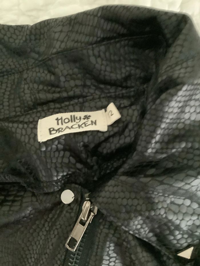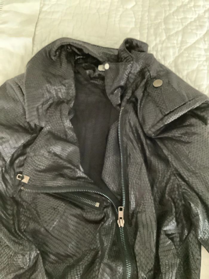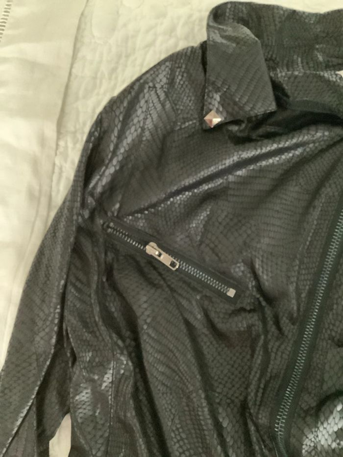 Haut zippé de style perfecto en tissu extensible façon lézard, avec épaulettes. Dimensions : voir photos. État neuf, jamais porté. Taille 2, convient à un 38 ou un petit 40. Poches factices.
