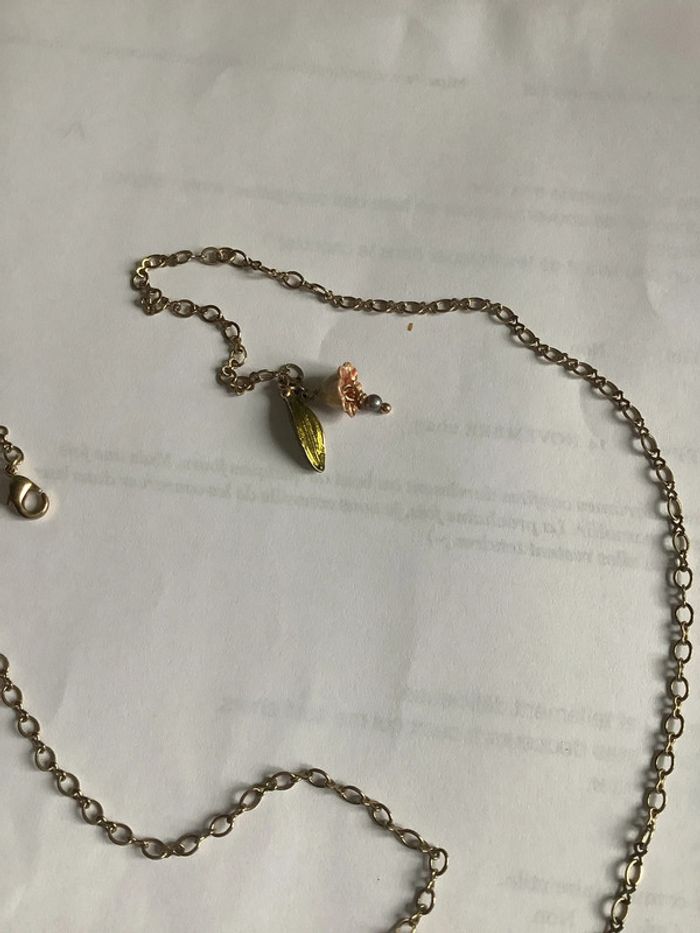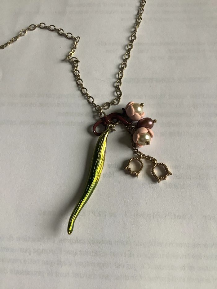 Collier « Muguet » constitué d’une chaîne en métal doré pâle (et non pas doré comme la couleur de l’or jaune, attention) et d’un pendentif de clochettes et de feuille de muguet émaillés avec deux perles ainsi que d’une clochette et d’une feuille au fermoir, création de Les Néréides collection années 2000, intemporelle. Peu porté, très bon état, voir photos.