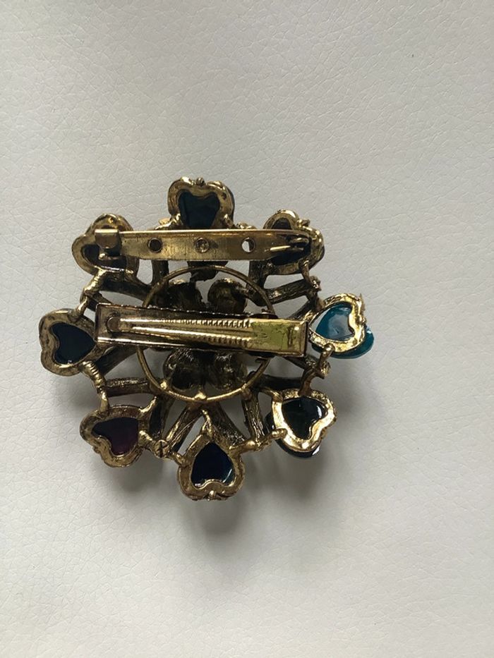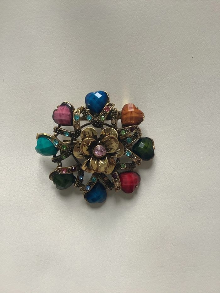Broche fleur faisant aussi pince à cheveux en métal doré, ornée de strass de couleur et de cœurs de verre coloré à facettes. Excellent état, jamais porté.