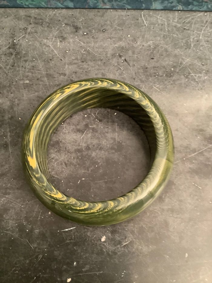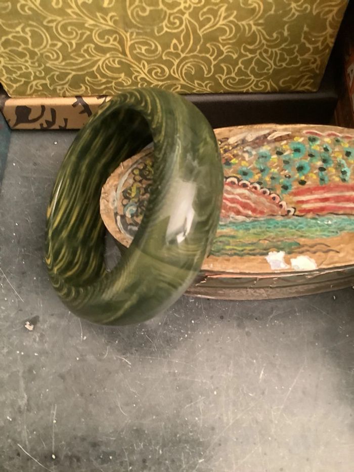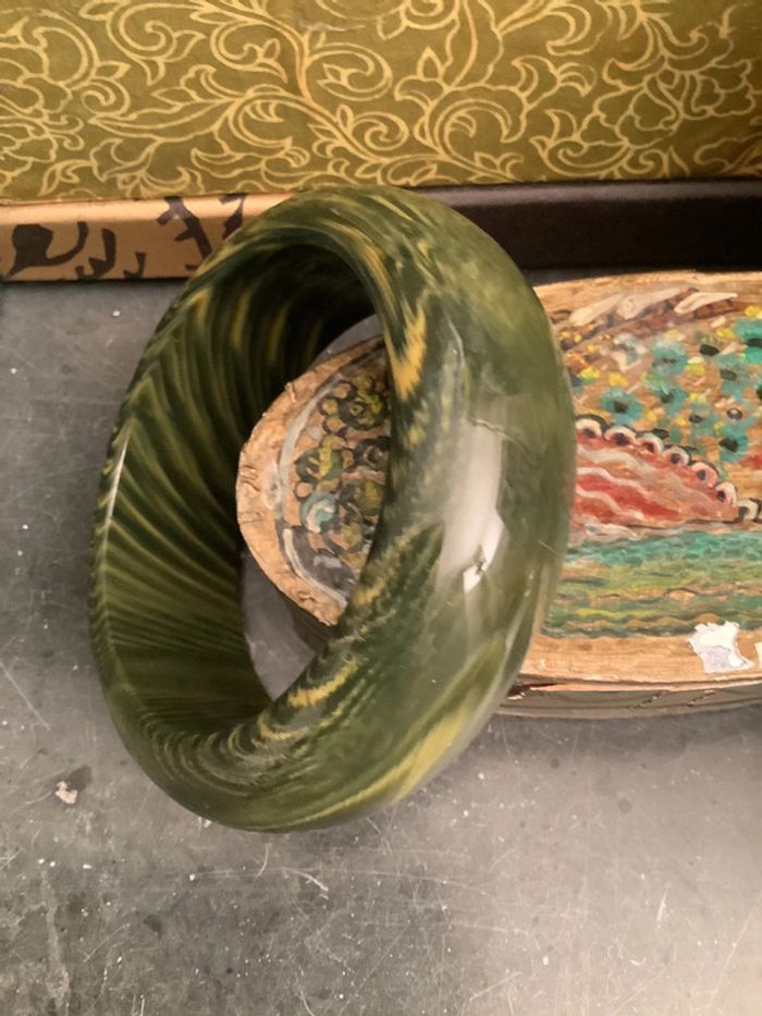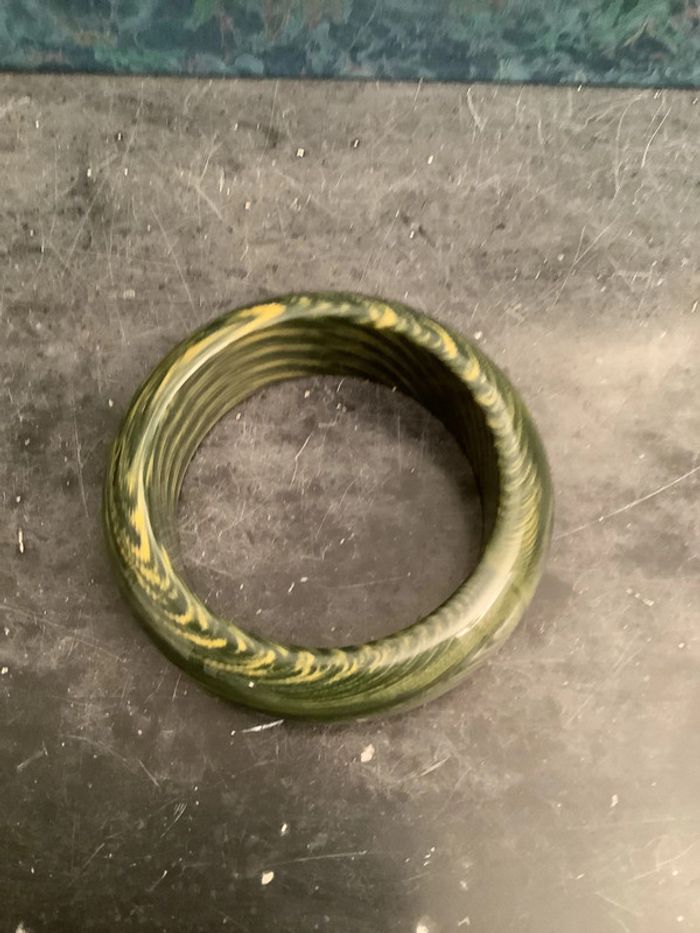 Bracelet jonc épais en résine veiné vert forêt et vert mousse. Jamais porté, excellent état. Diamètre intérieur: 6,7 cm Diamètre extérieur : 8,5 cm Largeur : 2,5 cm