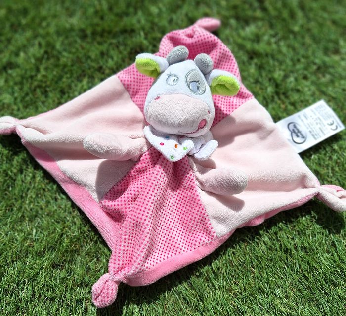 DOUDOU CARRE PLAT EN VELOURS DE COULEUR ROSE CLAIR ET ROSE FONCE A POIS AU CENTRE DU DOUDOU, TETE PELUCHE VACHE AVEC COCARD GRIS A UN OEIL BANDANA BLANC A POIS DE COULEURS AUTOUR DU COU 4 NOEUDS ETAT PARFAIT !