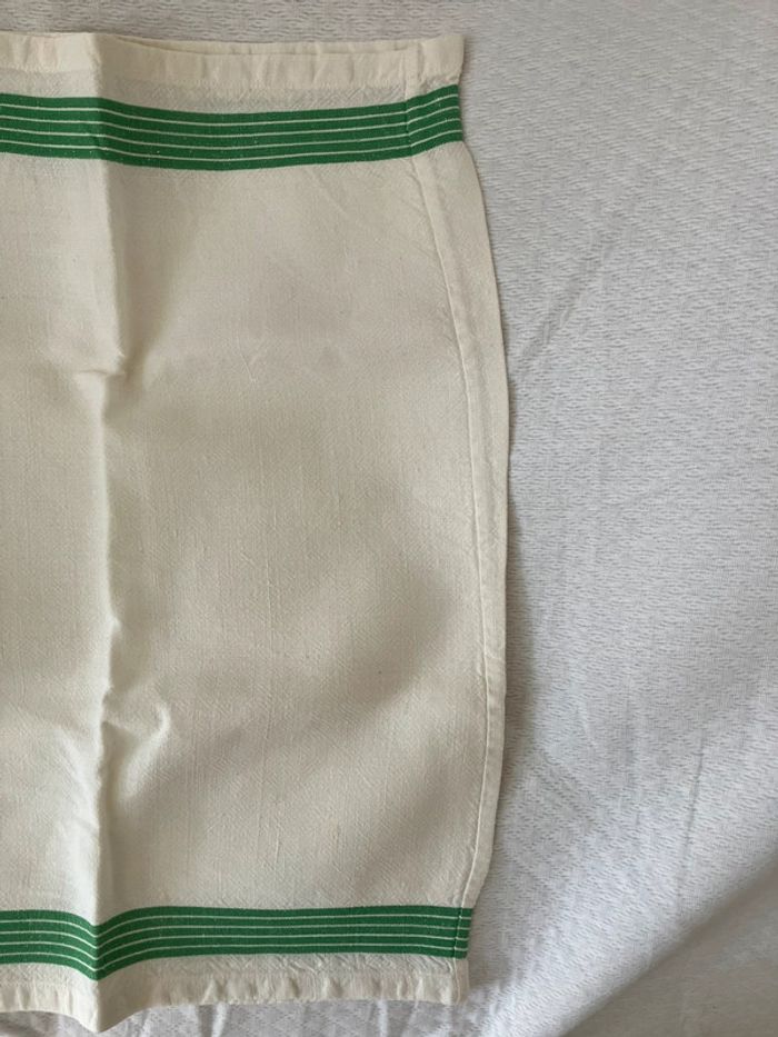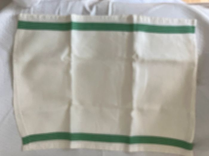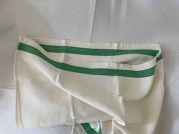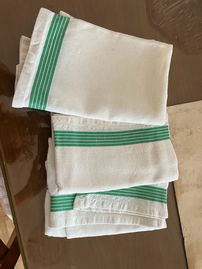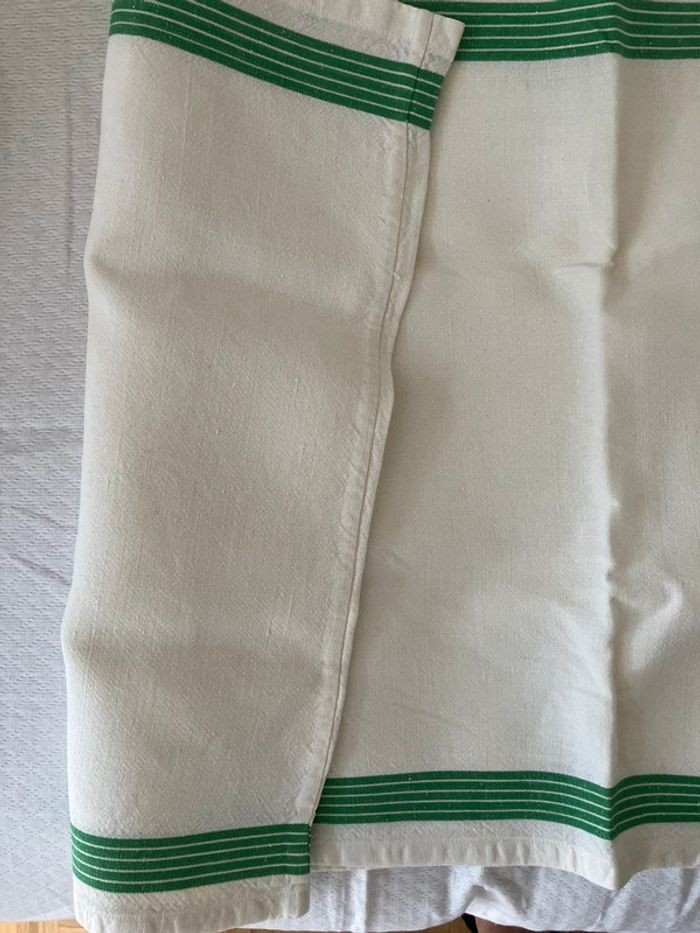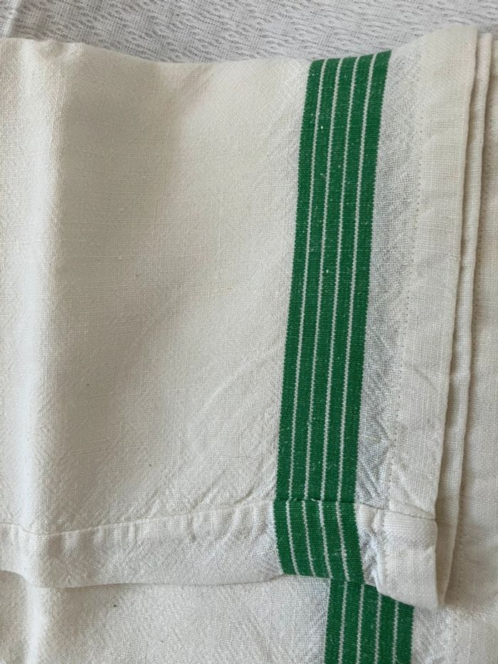 Lot de trois torchons anciens en lin naturel damassé bordé de vert pour rouleau dévidoir, état neuf, jamais utilisés. Très rare.