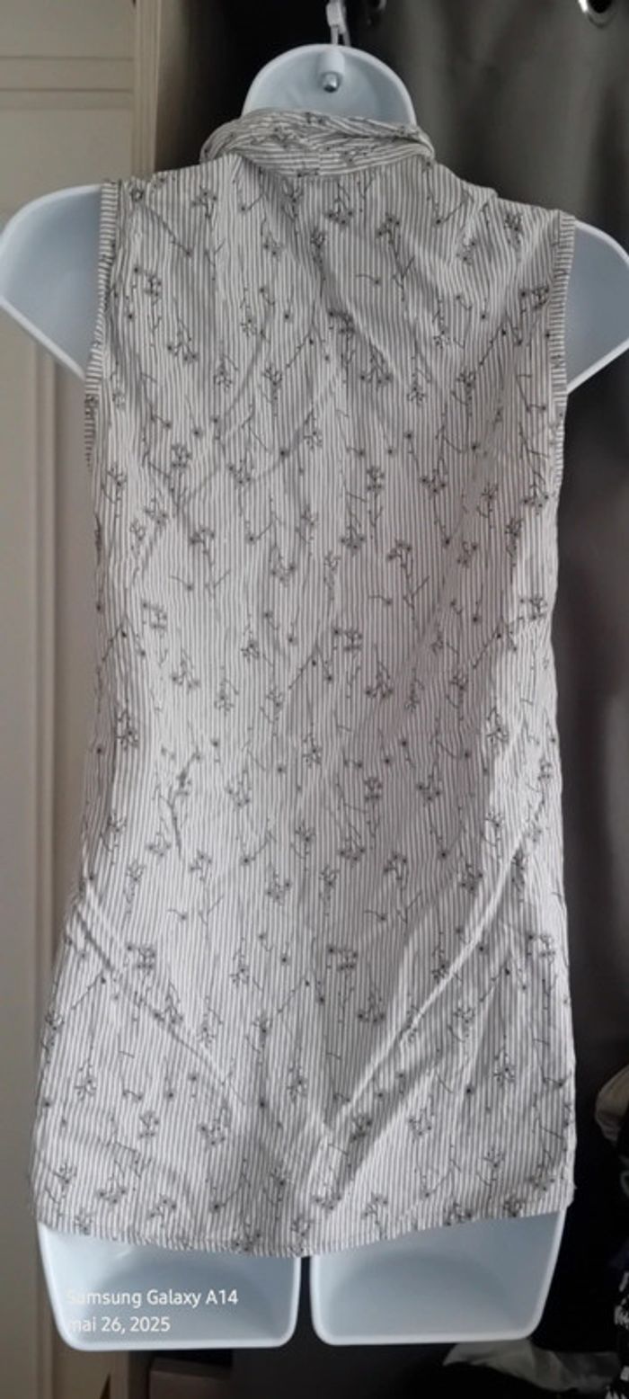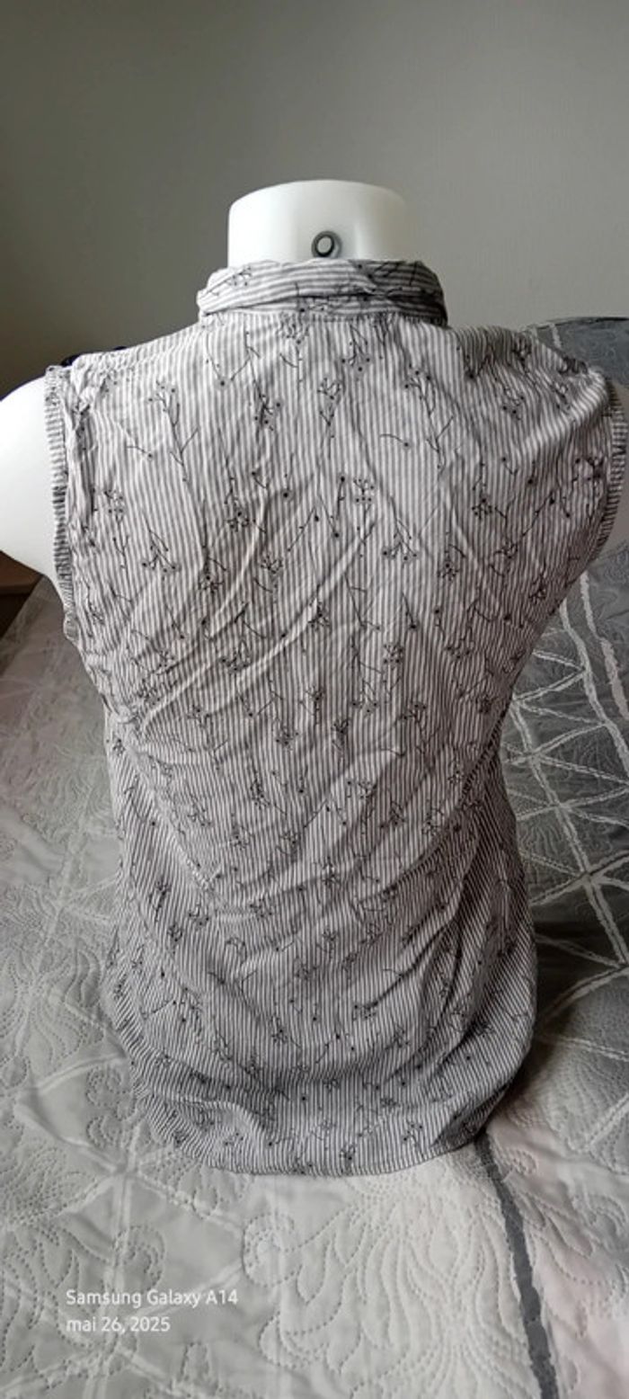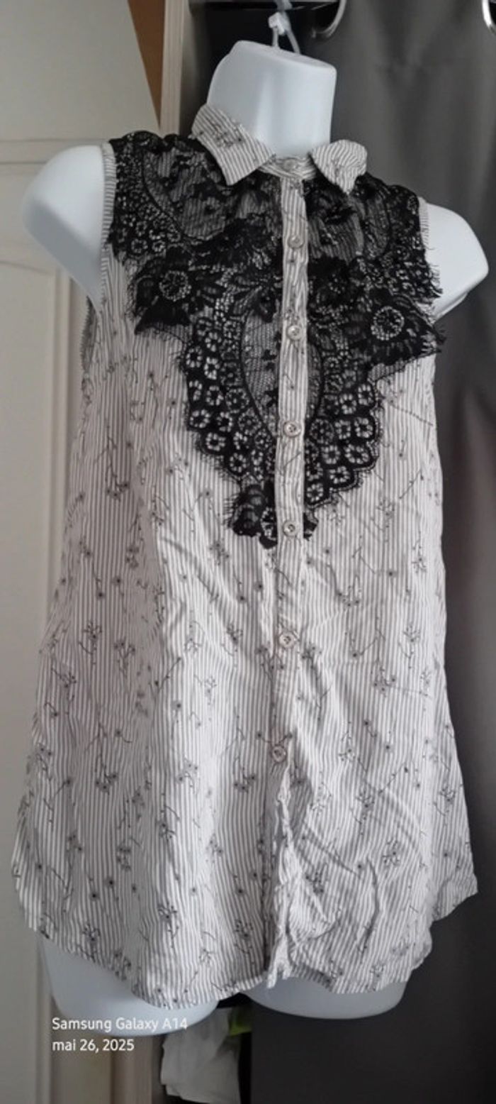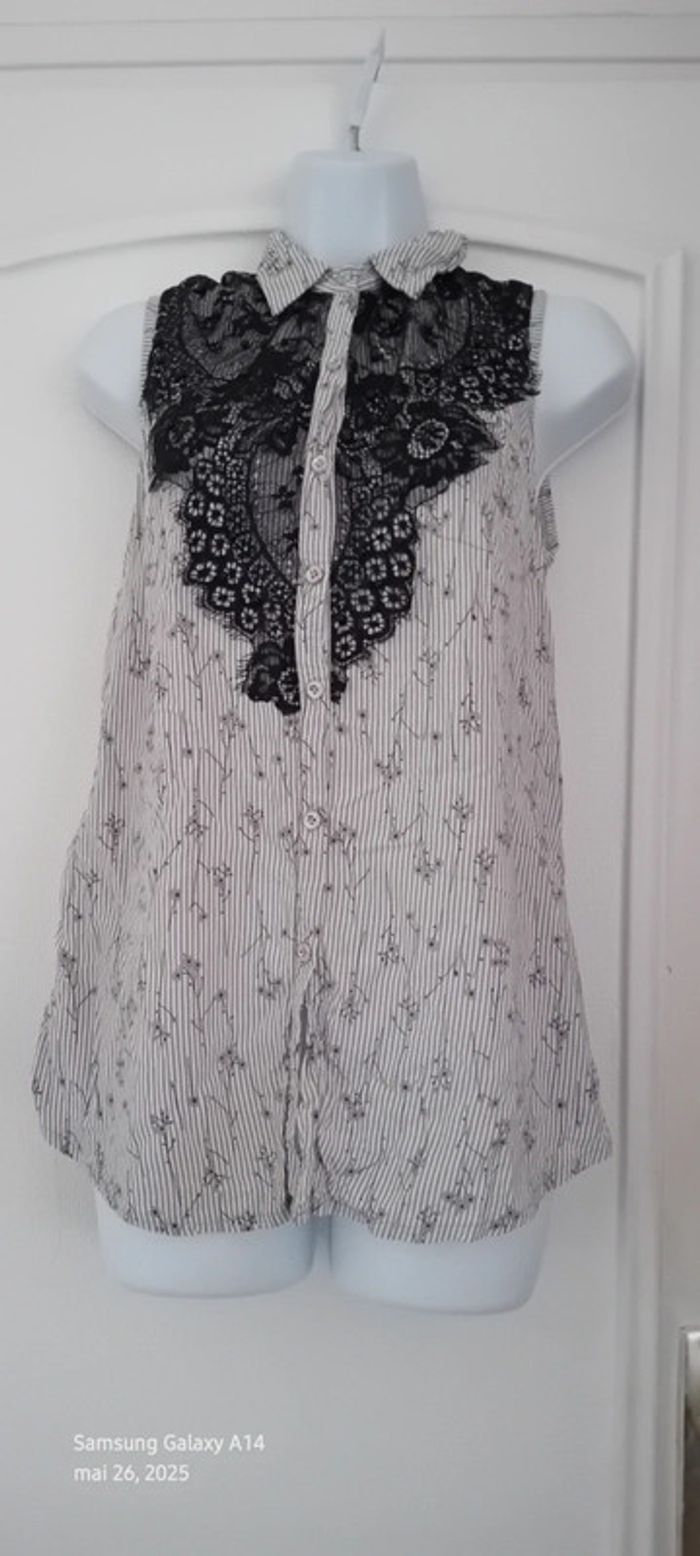 Blouse sans manches en coton et viscose matière légère et fluide avec boutons nacrés dentelle motif floral et perles noires rayures et fleurs longueur 67 cm largeur aisselles à aisselles 44 marqué taille 42 mais taille petit correspond plutôt à un 40 jamais porté état neuf #midole #midolefemme #midolefemme40 #femme40 #hautfemme40 #blousefemme40 #blousesansmanches40 #rayures #fleurs #hautavecdentelle #hautavecperles40 #dentelle #perles