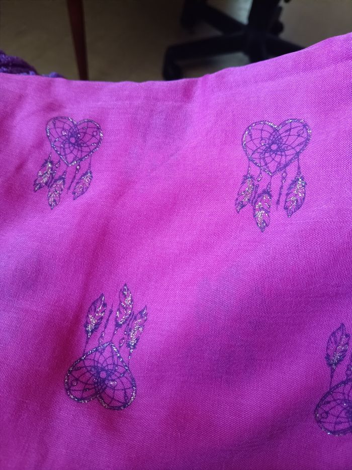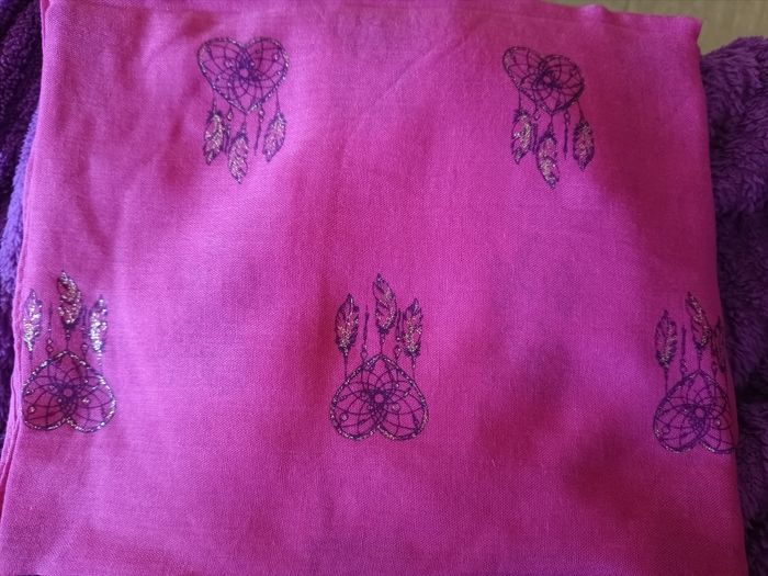 Foulard assez grand en longueur couleur fushia avec coeur en arbre de vie Doré pailleté et noir jamais porté 80%viscose et 20%coton neuve dans son plastique