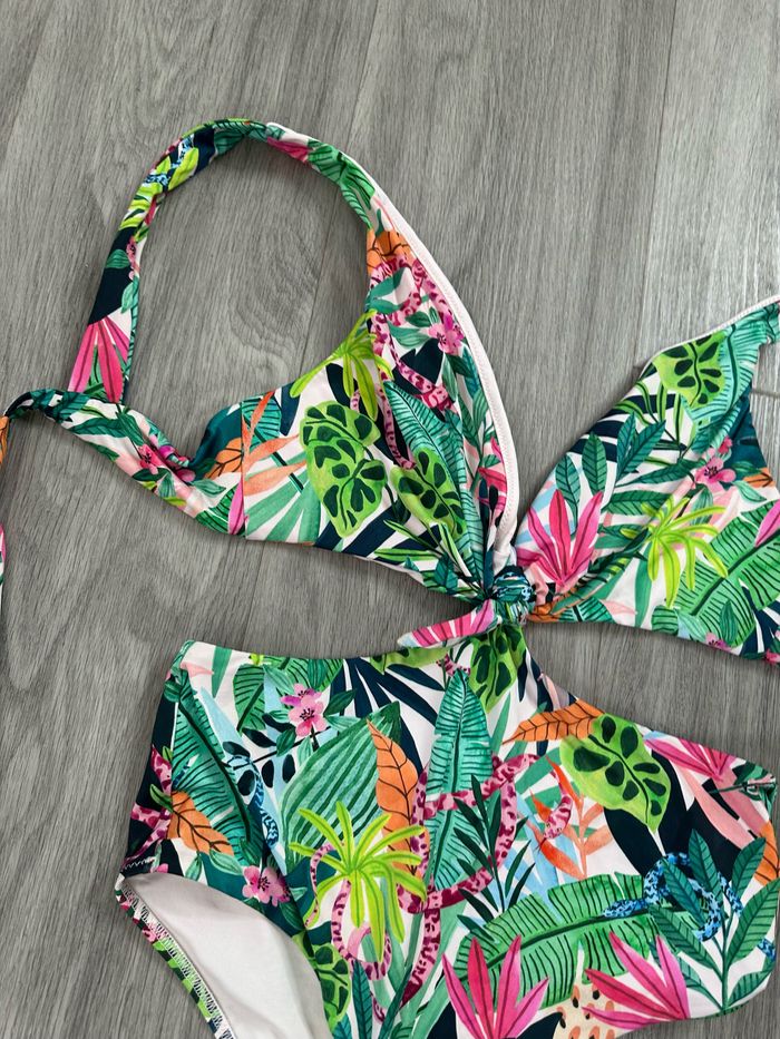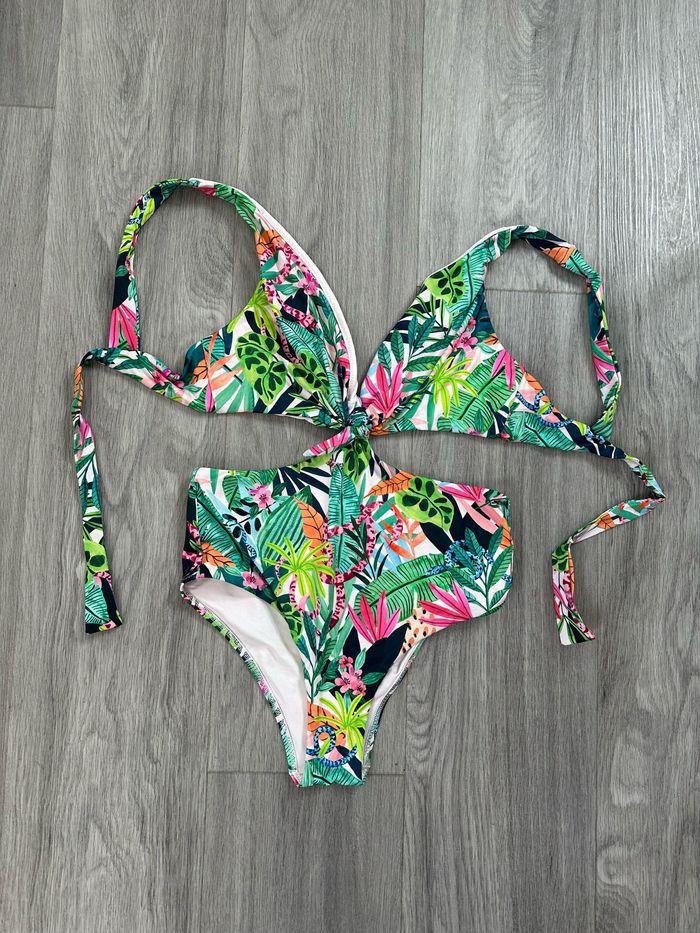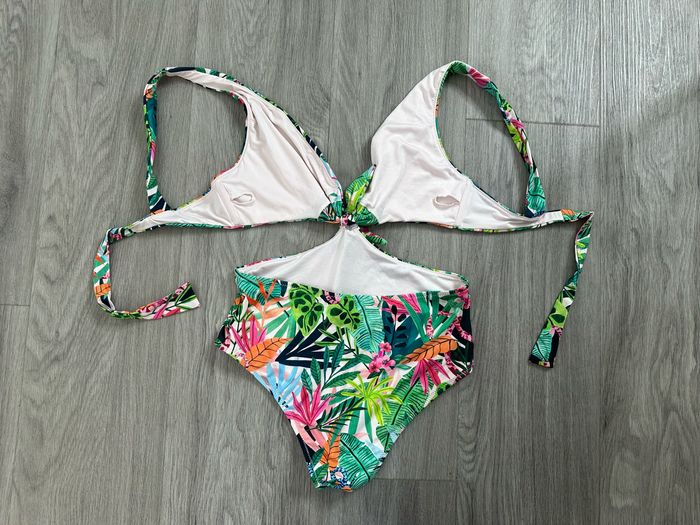 Trikini maillot de bain - Excellent état - Taille 38 équivalent M - Tissus multicolore - Imprimés tropicaux - Doublure intérieure - Possibilité de rembourrer le haut (il n’y a pas de pads inclus) - 3 pièces arrachées au niveau du ventre - Pas d’étiquette de taille ni de matière