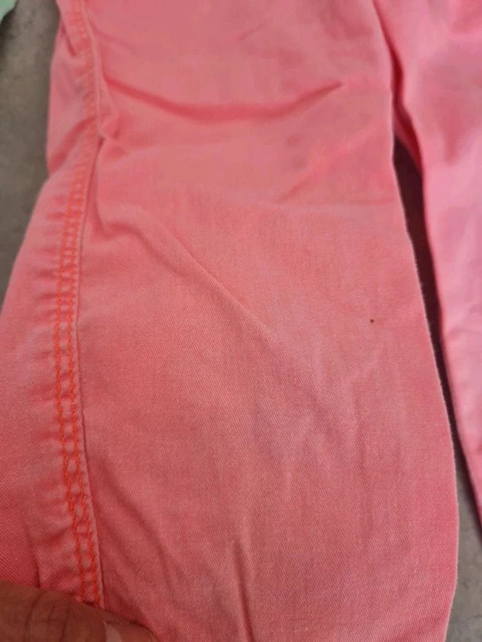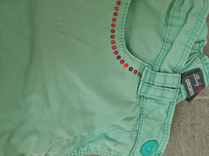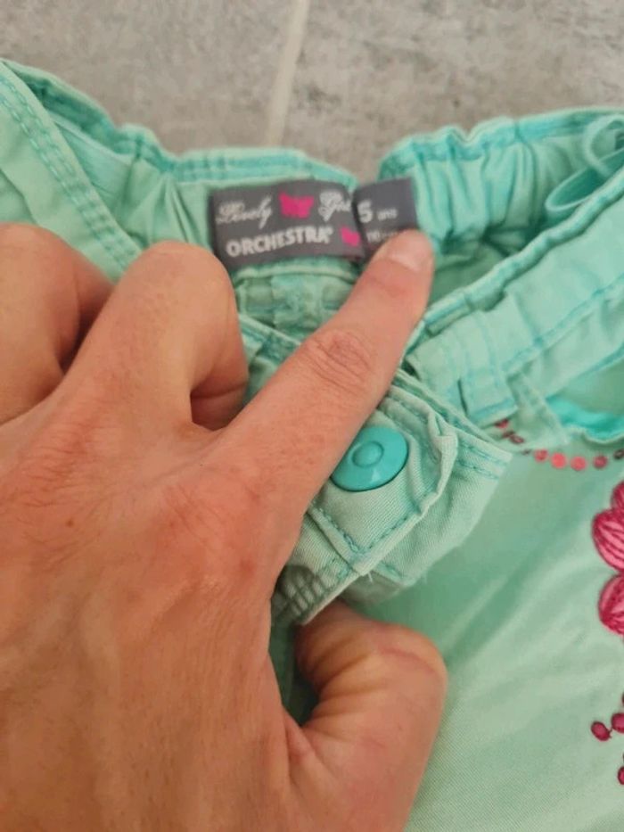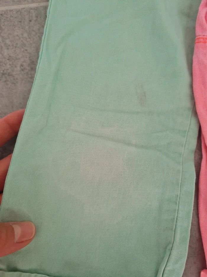 Lot de 2 pantacourts en jeans léger taille 5 ans Orchestra et Z. Un rose et un vert flashy menthe Couleur un peu délavée aux zones de frottements, quelques mini taches (photos) mais peuvent encore être portés . Articles lavés avant la vente, maison non fumeur