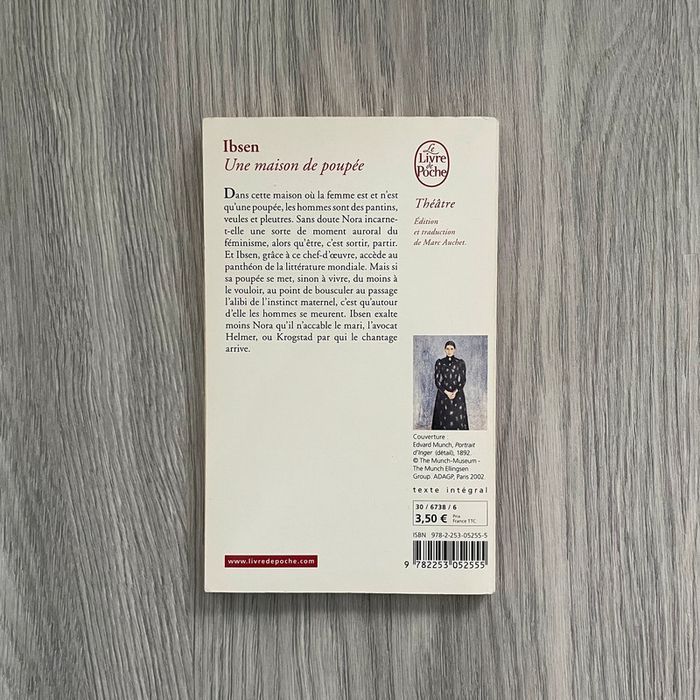 Bonjour, Je vends ce livre Une Maison de Poupée de Ibsen en édition Livre de Poche acheté dans le cadre du programme scolaire. Dans cette maison où la femme est et n'est qu'une poupée, les hommes sont des pantins, veules et pleutres. Sans doute Nora incarne-t-elle une sorte de moment auroral du féminisme, alors qu'être, c'est sortir, partir. Et Ibsen, grâce à ce chef-d'oeuvre, accède au panthéon de la littérature mondiale. Mais si sa poupée se met, sinon à vivre, du moins à le vouloir, au point de bousculer au passage l'alibi de l'instinct maternel, c'est qu'autour d'elle les hommes se meurent. Ibsen exalte moins Nora qu'il n'accable le mari, l'avocat Helmer, ou Krogstad par qui le chantage arrive. Introduction et traduction nouvelle de Marc Auchet. Remise en mains propres à Bussy Saint Georges. Envoi soigné avec une préférence pour Chronopost (plus proche et flexible) 📦