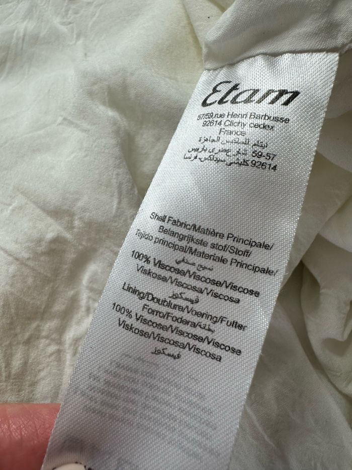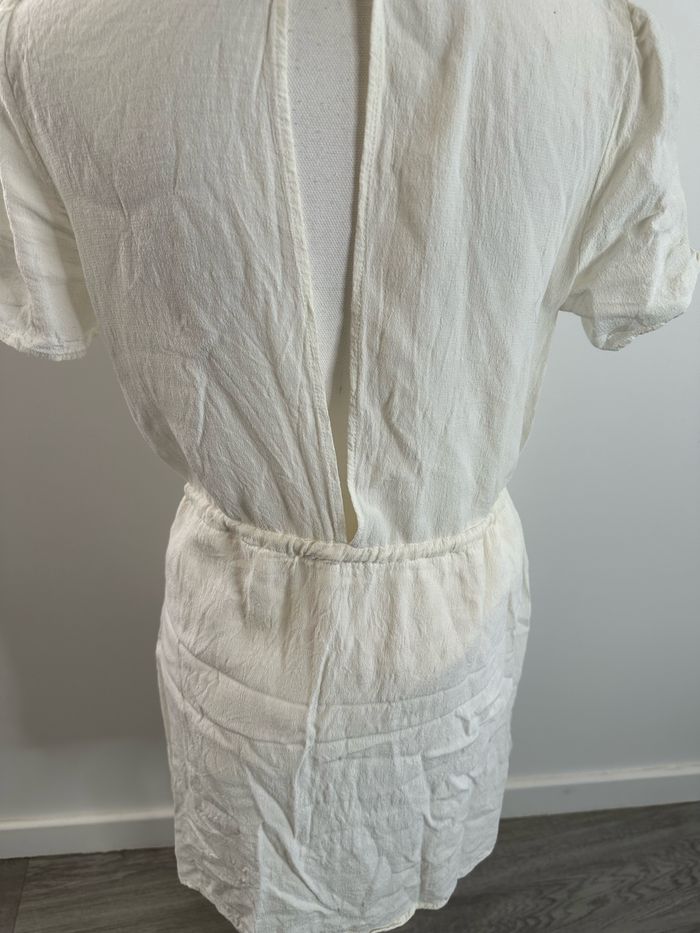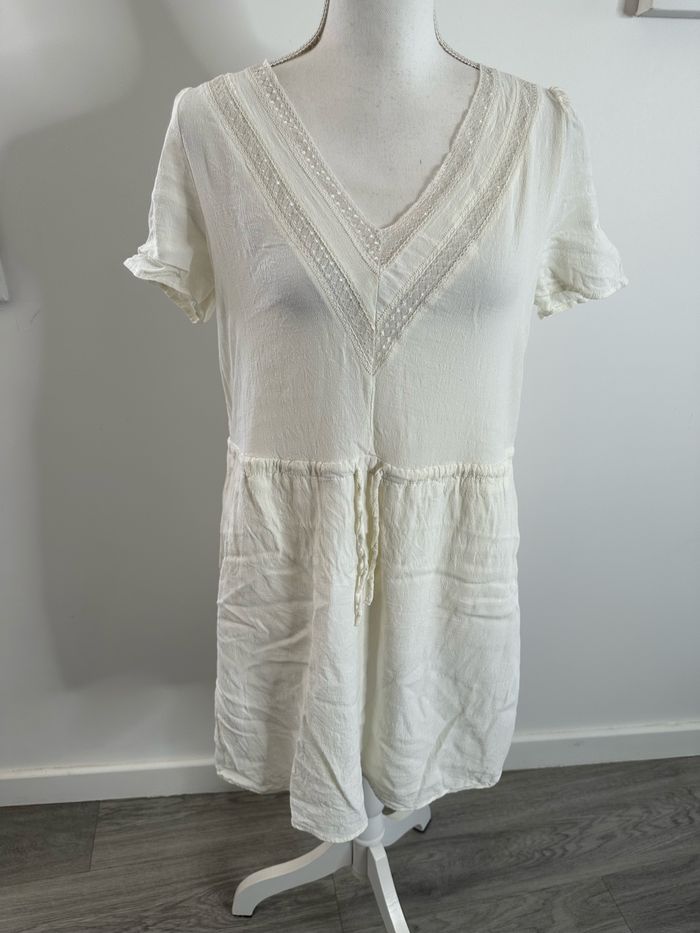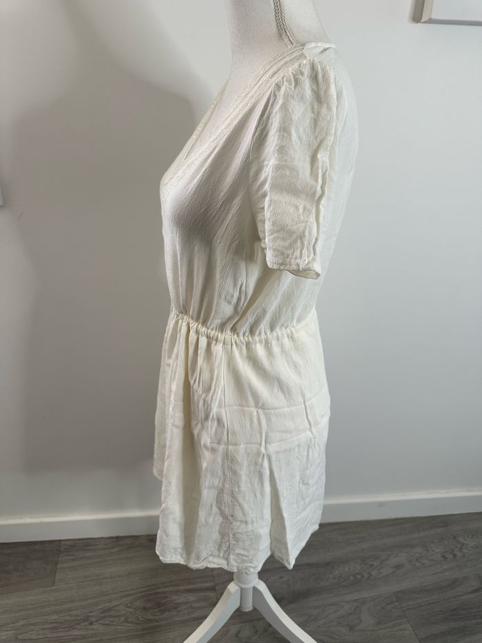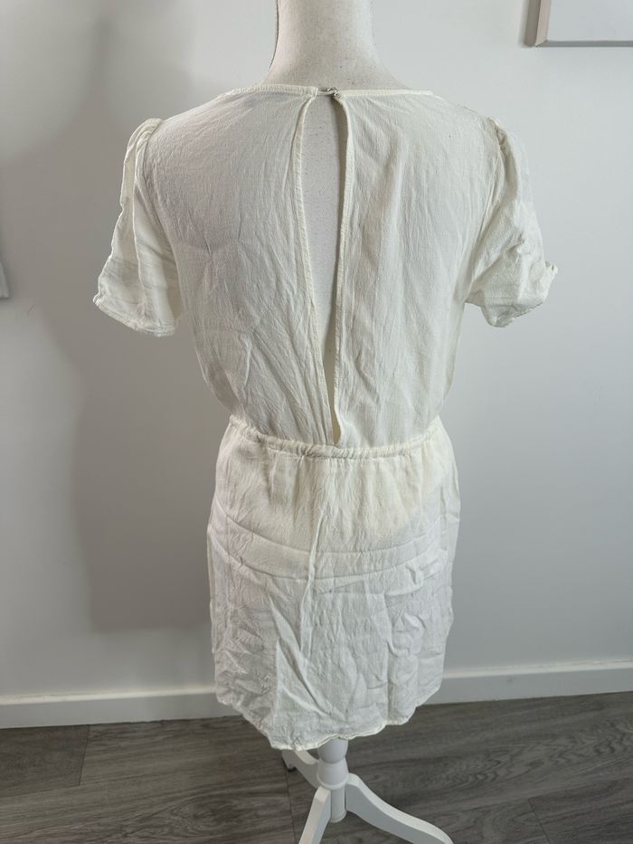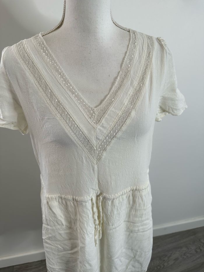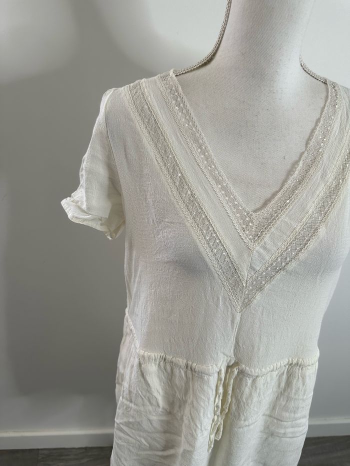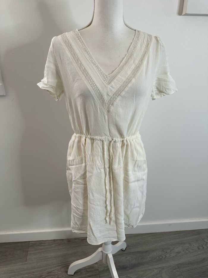 Robe - Excellent état - Taille 38 équivalent M - Marque Etam - Couleur blanc crème - Détails en dentelle - Col en V - Manches courtes - Grand décolleté dans le dos - Lien pour ajuster la taille - Doublure intérieure à l’avant et sur le bas - 100% Viscose Dimensions: - 50cm niveau aisselles - 82cm de long