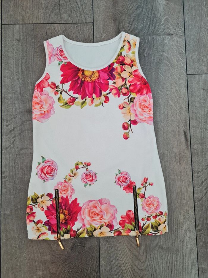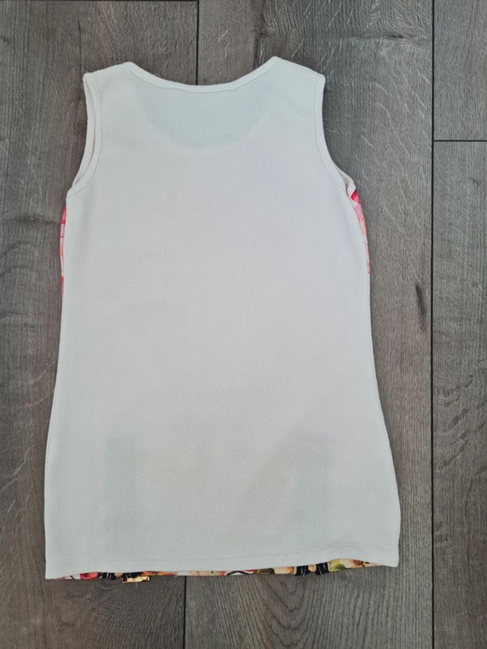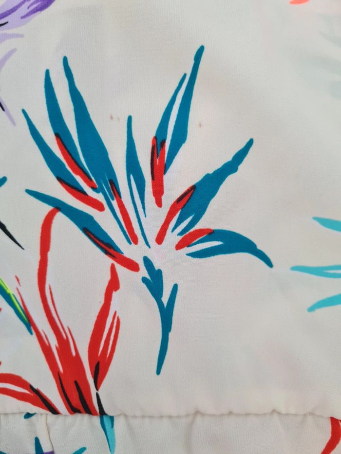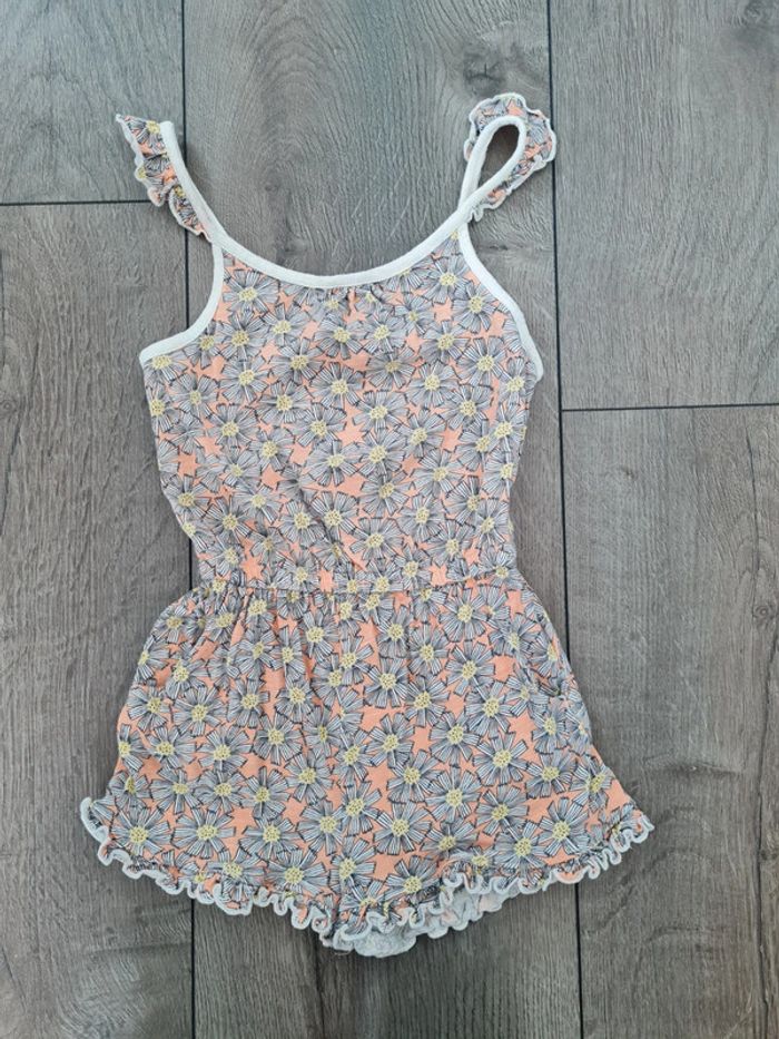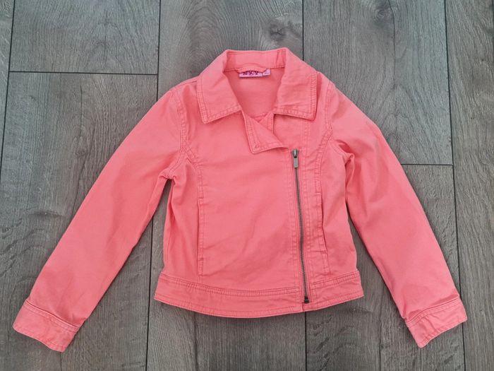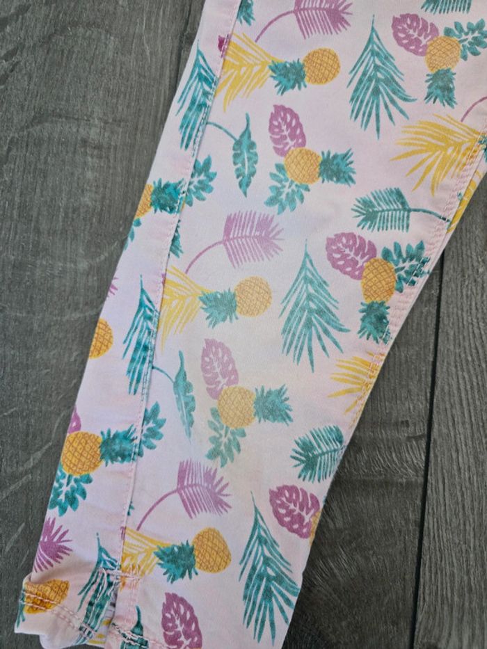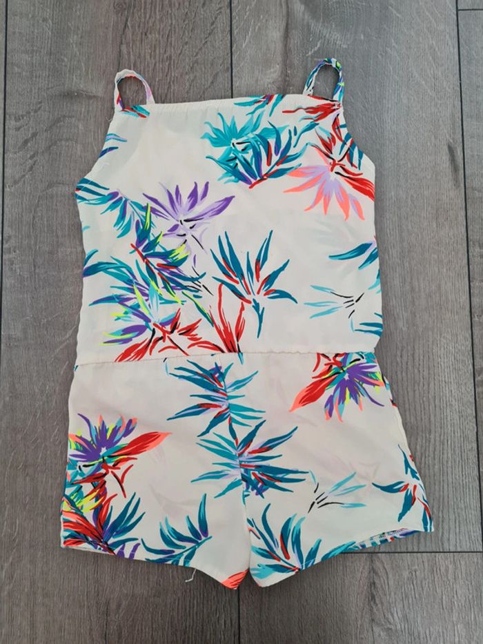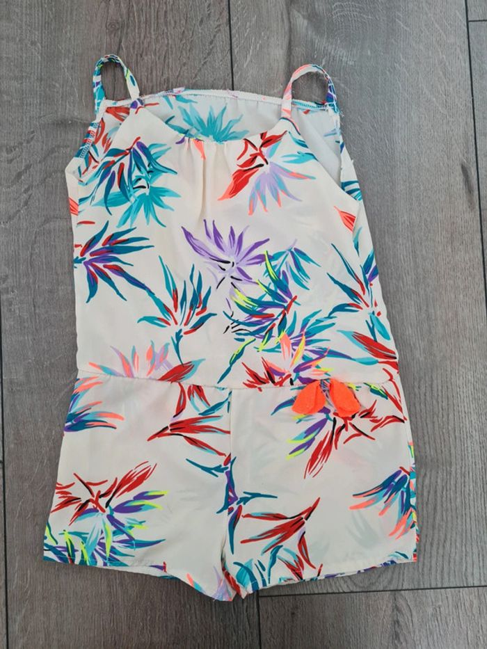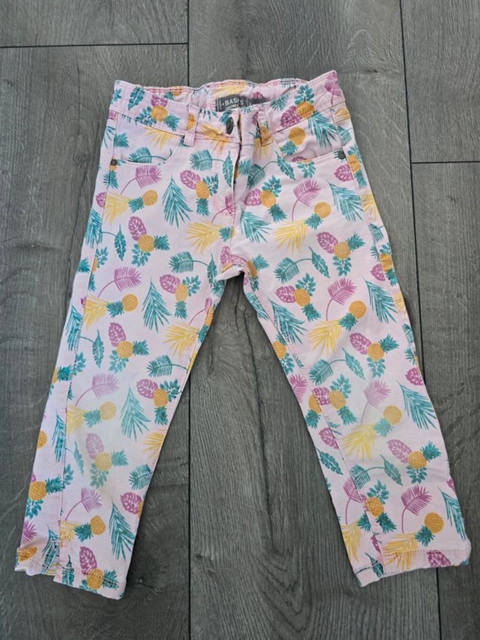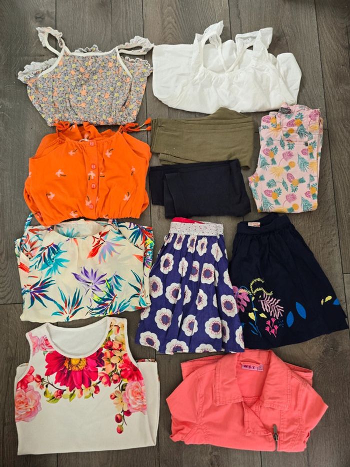 Lot fille été comprenant 1 veste, 2 leggings, 1 pantacourt, 3 combishorts, 2 jupes, 1 robe et 1 débardeur : Veste en jean rose avec fermeture éclair. NKY Jean pantacourt Orchestra motifs tropiques ananas, couleur delavee aux genoux. Legging court kaki, Catimini. Legging court bleu marine. Orchestra.Combishort orange avec palmiers.GÉMO.Fines bretelles. Combishort colorée, motifs feuilles, exotiques. 2 petites tâches dans le dos indiquées sur photo de près. Combishort Kiabi motifs fleurs sur fond orange clair, corail. Taille élastique. Une tâche su bretelles, peu visible, voir photo de près.Portée une fois. Jupe Du pareil au même. Bleu marine, motif feuilles.Doublée.Taille élastique et ajustable. Jupe bleue motif fleurs. DPAM. Devant boutons décoratifs. Taille ajustable. Une petite tâche sur une fleur indiquée sur photo de près. Reste en très bon état. Robe à fleurs avec 2 petites fermetures éclairs fantaisies. Débardeur blanc avec dentelles, Kiabi. Mis une fois. Petite tâche dans le dos, indiquée sur photo de près.
